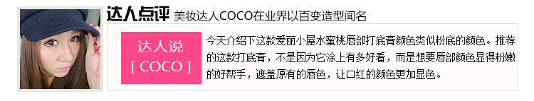 | 今天我们就重点讲下 这款爱丽小屋水蜜桃唇部打底膏 另外这款唇部遮瑕不是很油腻,遮瑕效果也相对比较高 所以不只能用在嘴巴上 它还可以用来遮盖脸部瑕疵、黑眼圈, 我还经常拿它当遮瑕膏用,小伙伴们也可以参考哦