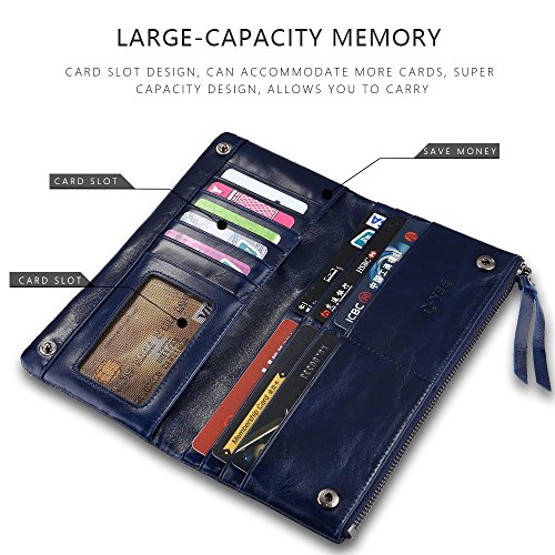 -. Feature : 100% genuine leather wallet,with luxury head layer oil wax cowhide leather soft,strong toughness and durability. / The womens wallets have high quality hardware,do not fade,zipper smooth,uniform car line. / 12 silver card credit card,2 Large bills pocket,2 slider zip lock bag. / The wallets design for women,Brown make wallet looks more temperament. / Wallets for women size: 7.88*4.33*1.58 inches,the weight about 0.35 pounds,convenient to carry.