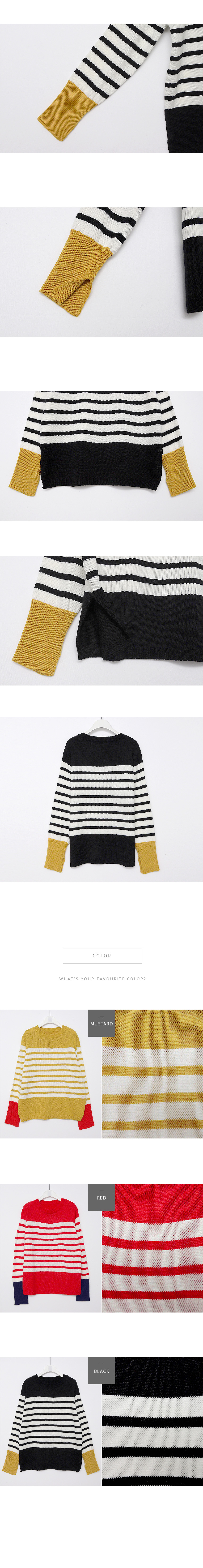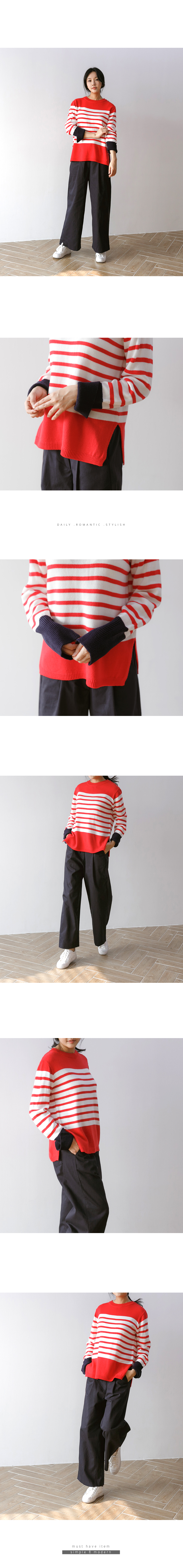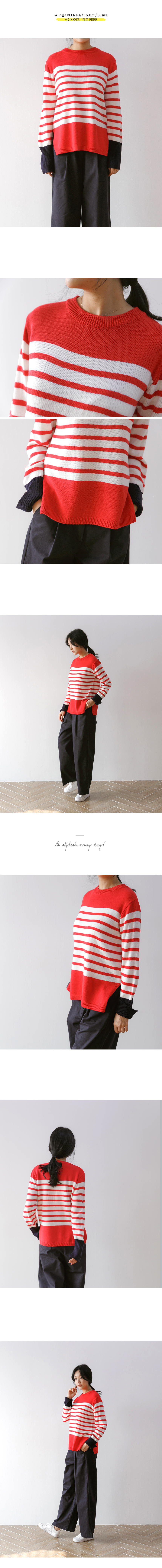 언제나 입기 좋은 두께감과 매트한 아크릴 원사로 가볍고 부드러운 소재감의 스트라이프 니트예요.산뜻한 컬러감과 소맷단의 배색으로 독특하면서도 편안한 무드의 아이템이랍니다^^너무 붙거나 헐렁하지 않은 내추럴한 핏으로 이너로 단독으로 활용도 높은포인트 아이템이에요!색상은 머스터드, 레드, 블랙사이즈는 FREE44~66반▼ 관련상품 : 제르맹 주름 와이드팬츠