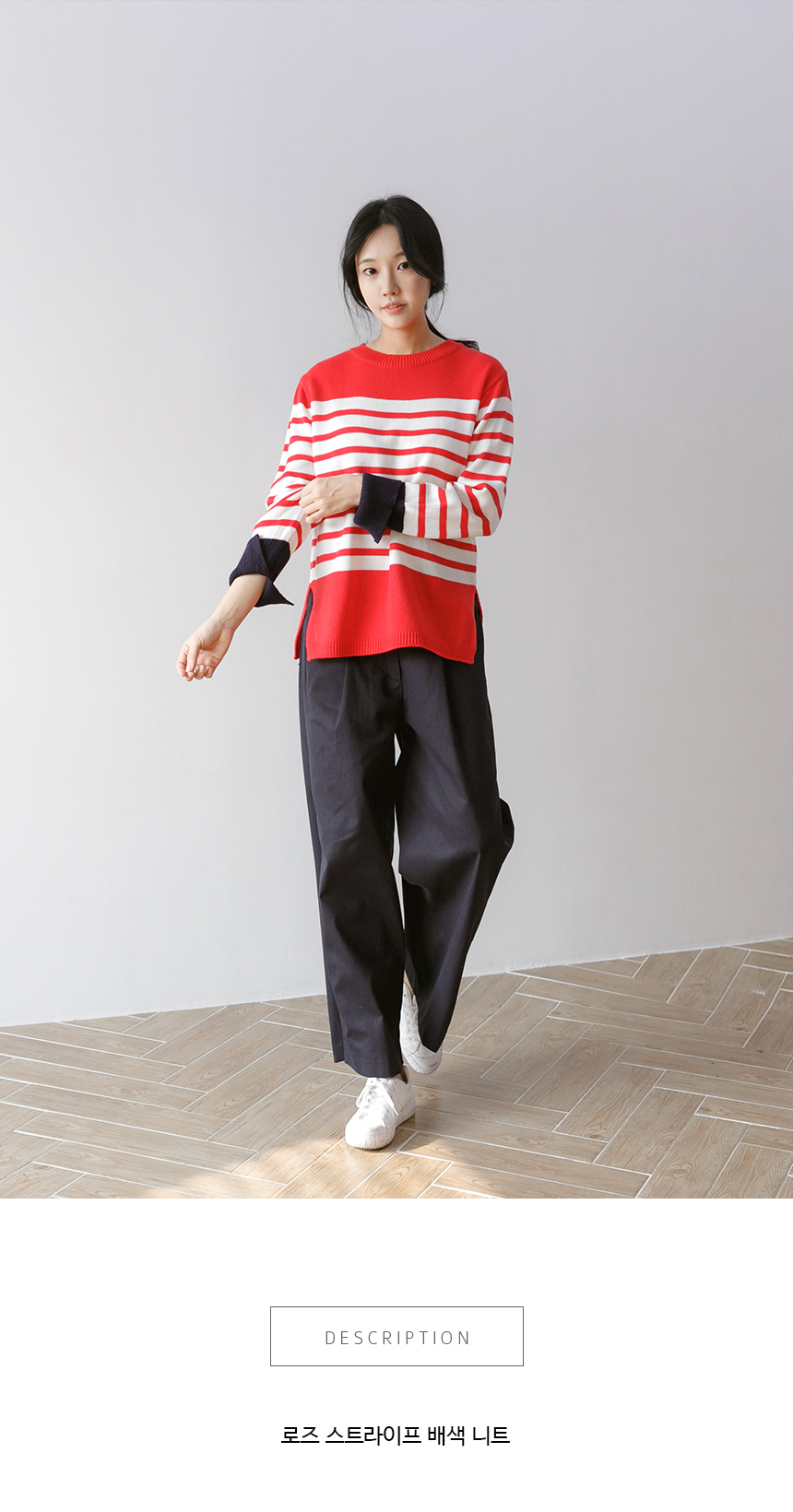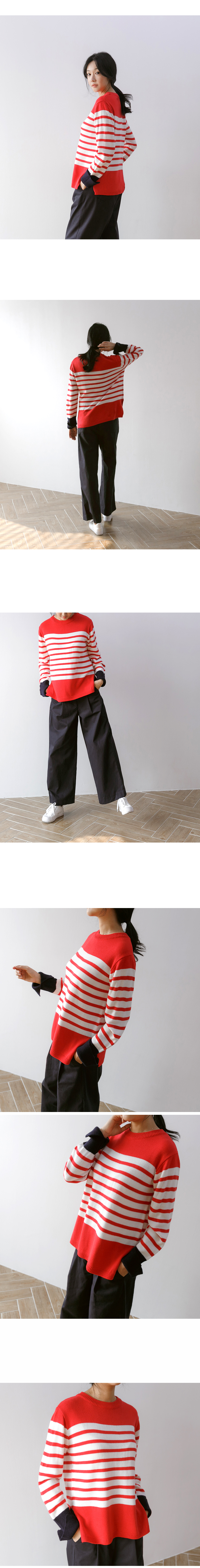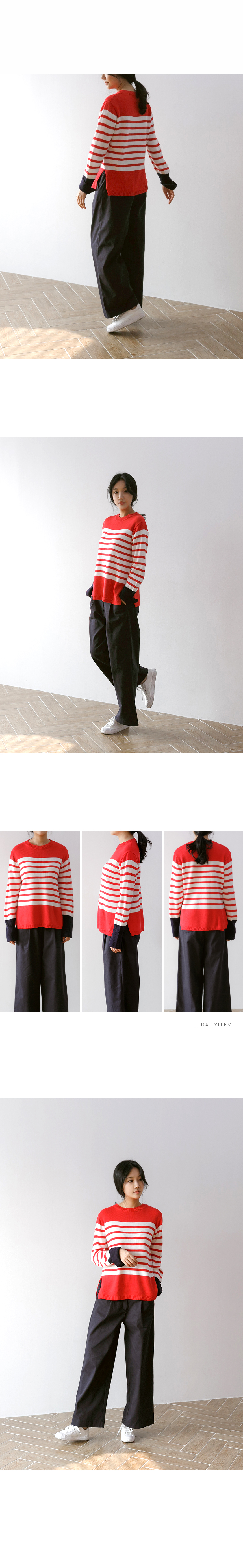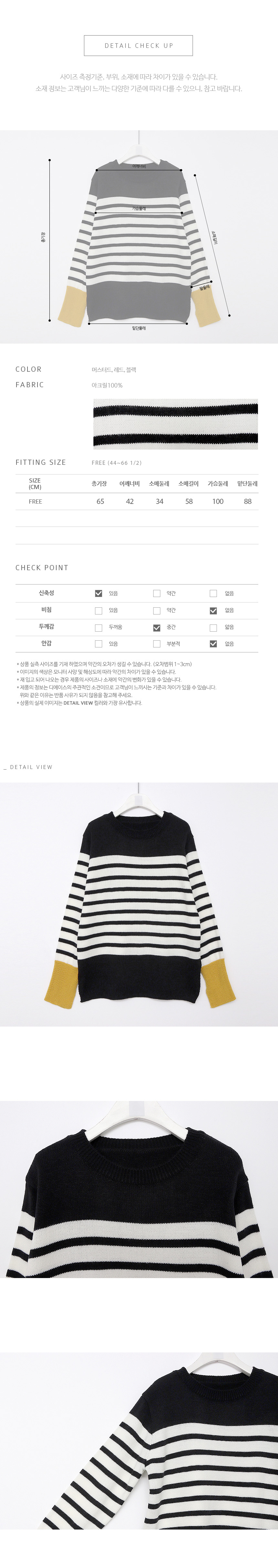 언제나 입기 좋은 두께감과 매트한 아크릴 원사로 가볍고 부드러운 소재감의 스트라이프 니트예요.산뜻한 컬러감과 소맷단의 배색으로 독특하면서도 편안한 무드의 아이템이랍니다^^너무 붙거나 헐렁하지 않은 내추럴한 핏으로 이너로 단독으로 활용도 높은포인트 아이템이에요!색상은 머스터드, 레드, 블랙사이즈는 FREE44~66반▼ 관련상품 : 제르맹 주름 와이드팬츠