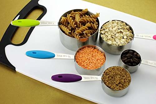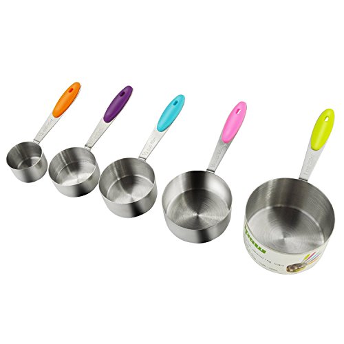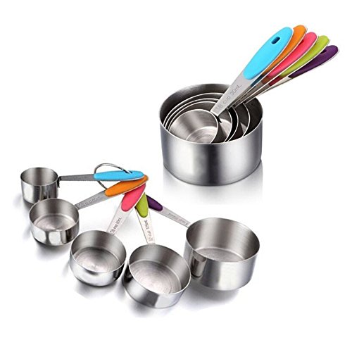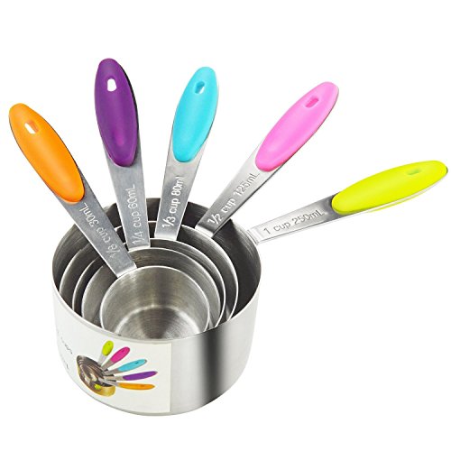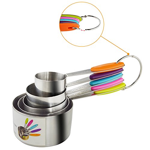 -. Feature : Durable & accurate stainless steel measuring spoons cups Set includes 5 different sizes : 1/8 cup 30ml, 1/4 cup 60ml, 1/3 cup 80ml, 1/2 cup 125ml and 1 cup 250ml,great for most basic recipes,any soft, liquid or seasoning cooking ingredients including Flour, Honey, Canola Oil, Olive oil, Vinegar, Mustard, Ground cumin, Chili powder, Dried oregano, Salt, Ground black pepper and many more. / Made of strong, corrosion resistant and polish stainless steel.Its total weight is 13.5 Ounce,other's is just 8 Ounce.Tough, sturdy stainless steel will not bend and break when scooping ingredients / Brightly colored Measuring cups handle,more beautiful than other average measuring cups and brighten your kitchen.Soft rubber handles provide added user comfort and better grip.Engraved measurement markings on the handle. Soft detachable silicone handles.The ring organizer to hold the spoons together. / With handy loop and nests design keep them together, more easy to storage and clean / Each cup attach to one removable stainless-steel ring desparately,can take them off the ring easily ;The measuring spoon set is very durable and resistant to dents, heat and scratches. They can also accentuate your kitchen design and decoration - great contrasts to other cooking items made of woods or plastic!Dishwasher safe.