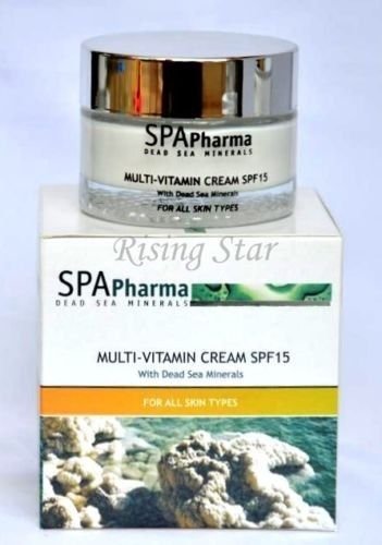 You are buying a Dead Sea Multivitamin cream by "Spa-pharma", a leading Israeli dead sea cosmetics manufacturer. SPA Pharma Multivitamin Cream SPF15 with Dead sea minerals. This concentrated formula by Spapharma slows down the aging process. Enriched with dead sea minerals that balances skin moisture level. Your skin becomes softer and elastic. This formula is combined with a complex of vitamins A, B3, B5,E, pomegranate seed oil, aloe vera plant extract and sunscreen. Excellent use as a basis for makeup application as well.Feature