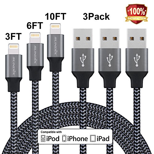 iPhone Charger, Sundix Lightning Cable 3Pack 3FT 6FT 10FT Nylon Braided 8Pin Lightning Charging & Sync Charger Cord for iPhone7,7Plus, 6s, 6sPlus,6, 6Plus, iPhone5,5s,5c,SE, iPad, iPod & More (Black)