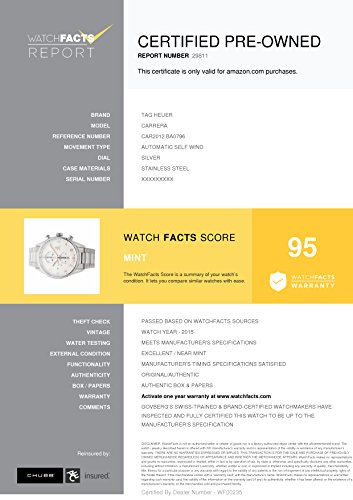 -. Binding : Watch -. Brand : TAG Heuer -. Department : mens -. Feature : Tag Heuer Carrera CAR2012.BA0796 with stainless-steel bezel and silver dial / Authenticated by WatchFacts. Grade Rating: 95 / Condition: Mint / Comes with original box and manufacturer's papers offered with this watch / Automatic-self-wind movement / Watch year: 2015 -. Label : Tag Heuer -. Manufacturer : Tag Heuer -. MPN : A2HN- EAE00CARRERA-JK-CPO -. NumberOfItems : 1 -. PackageQuantity : 1 -. PartNumber : A2HN- EAE00CARRERA-JK-CPO -. ProductGroup : Watch -. ProductTypeName : WATCH -. Publisher : Tag Heuer -. Studio : Tag Heuer -. Title : Tag Heuer Carrera automatic-self-wind mens Watch CAR2012.BA0796 (Certified Pre-owned)