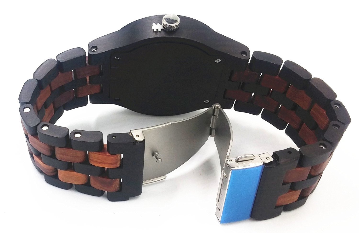 2, adopt a simple three-fold buckle, the belt part, back wrap to the back cover Because the natural wood use, the watch is light, it is also less burdensome to the arm