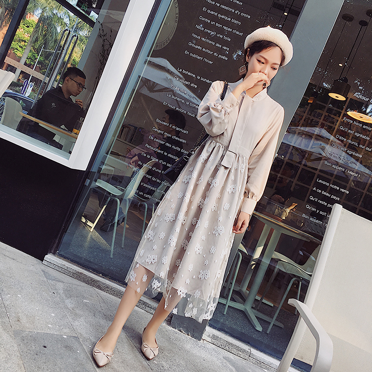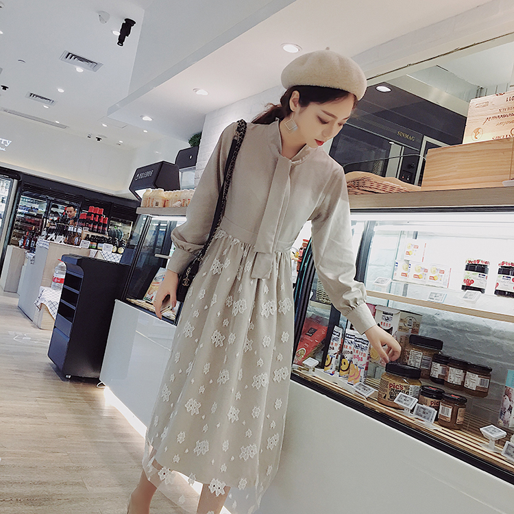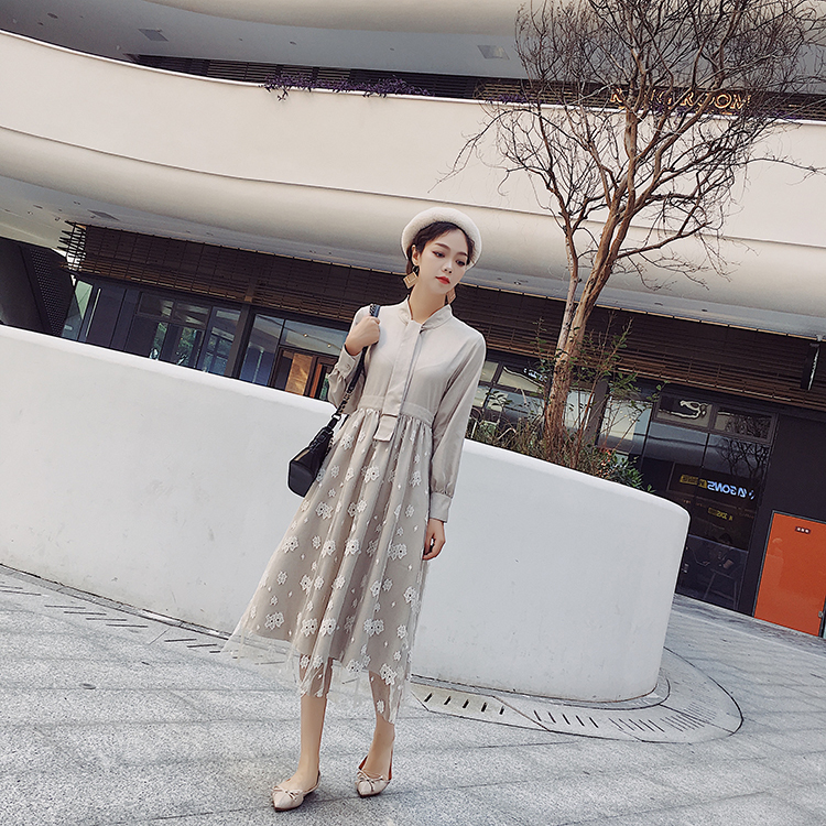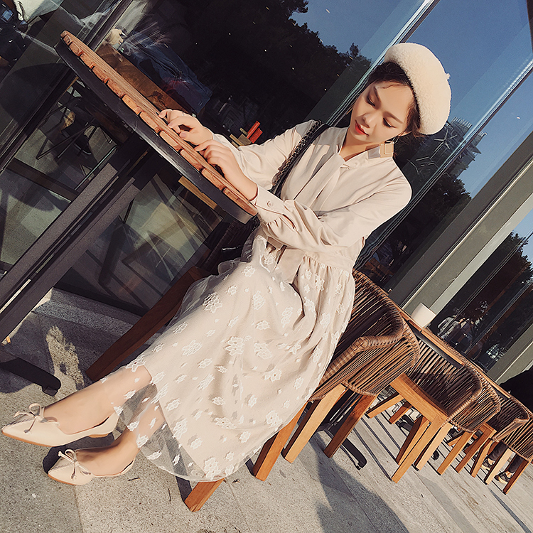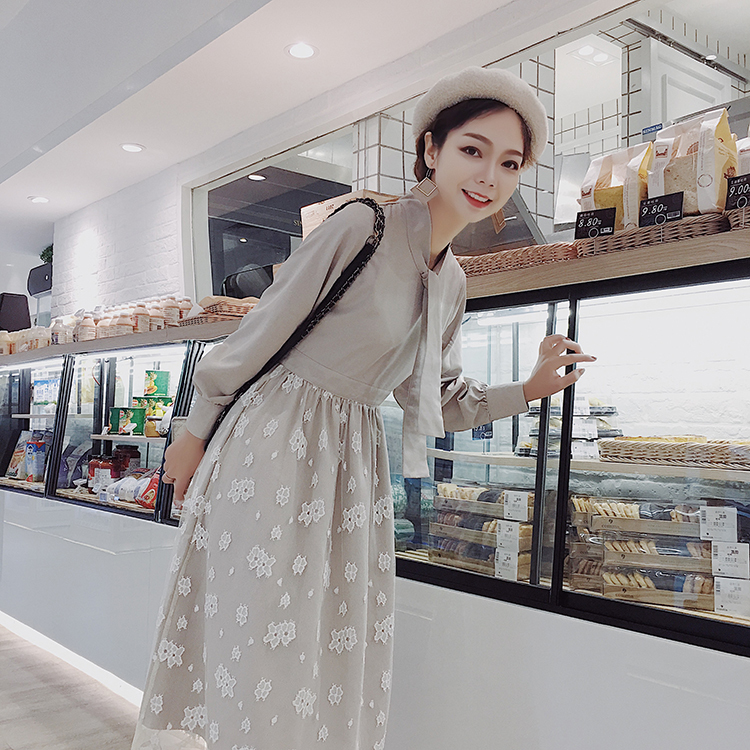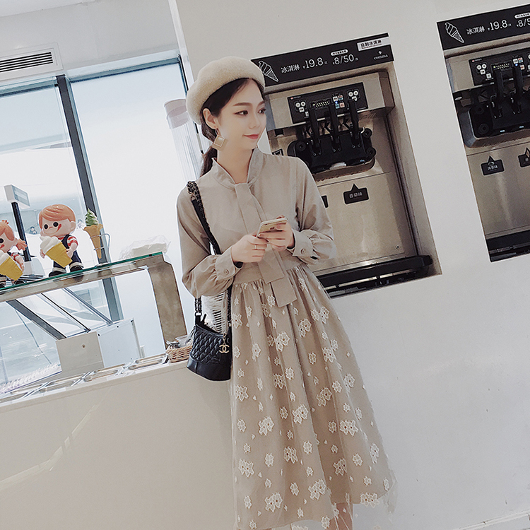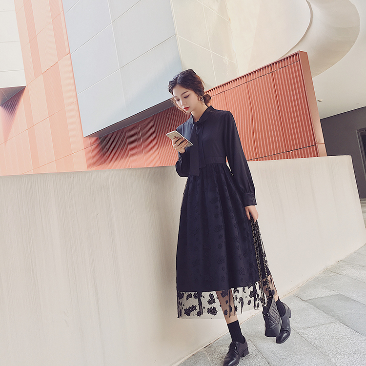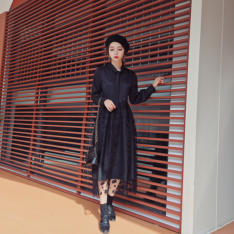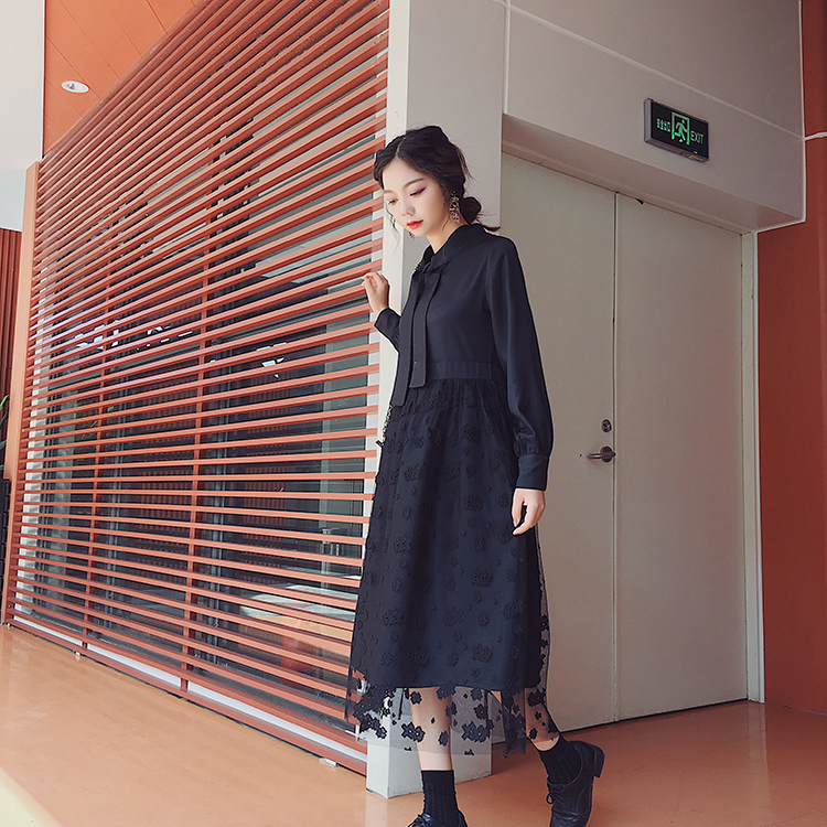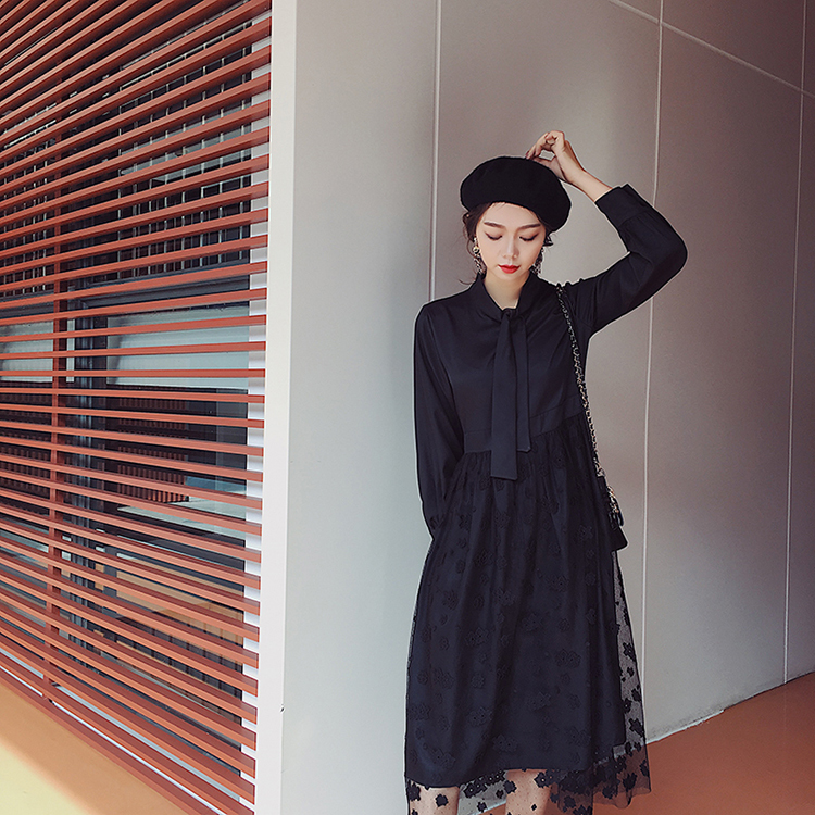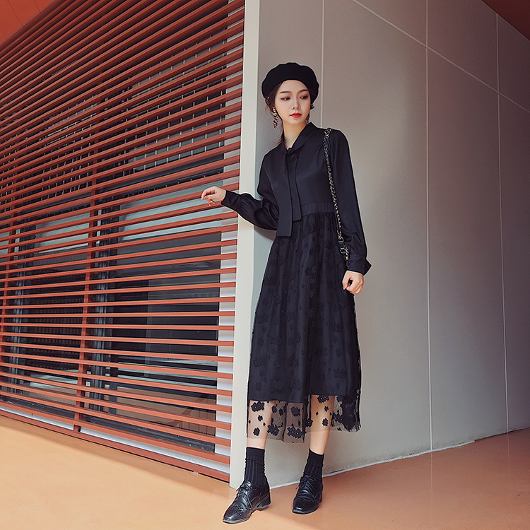 ボウタイシャツとレーススカートの切り替えしデザインがお洒落なワンピース♪