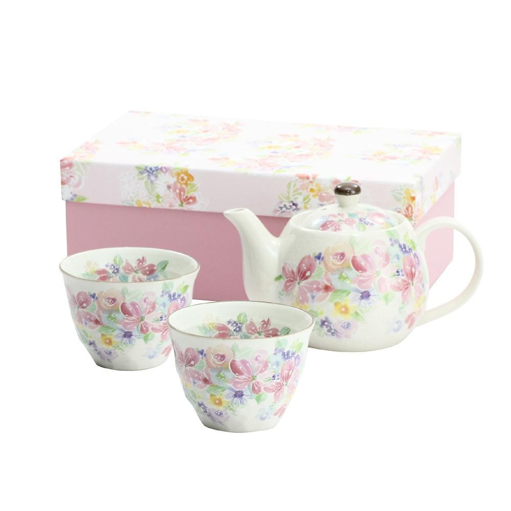 | 桜をはじめ、様々な花をちりばめた煎茶碗に、ポットがついたペアセットです。煎茶碗やポットと同じ柄の化粧箱に入っているので、ギフトにもぴったり。 |