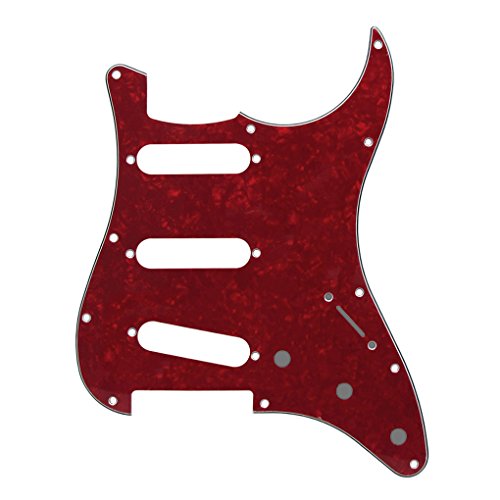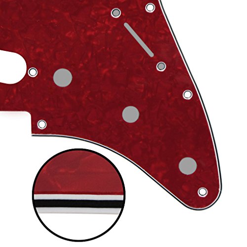 Product Description Feature: * For US Modern Fender Strat Stratocaster style guitar or similar.* With pure aluminum foil shield on the backside, not the common aluminum-foil paper on the market, better shielding property and anti-interference.* All materials are environmentally friendly, thermostability, no smell. Multi-layer plates are pressed under high temperature and pressures, to make them close integration between each layer, will not appear curly, deformation, or separation of different layers.* Excellent product process ensure the edge of the smooth and structured.Two layers of protective films on the front of pickguards, anti-scratch to protect the guitar.Specification:* Style: SSS(single/single/single coil) style pickguard; 11 screws holes in the side of pickguard.* Material: 4Ply Pearl Plate and PVC* With pure aluminum foil shield.* Color: Red Pearl* With protective film on the surface, while using please split it off.* Note:Item's color might be different from the picture because of the aberration.Package Includes:1 x guitar pickguard 0