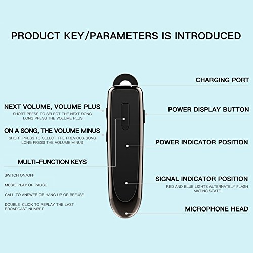-. Feature : ★【VOICE PROMPT FUNCTION】Voice Prompt function enables inform the using status at any time; Support automatically reporting in-coming phone number, you will never miss a call. Support battery monitoring. / ★【SUPER LONG BATTERY LIFE】Built-in 260mAh lithium-ion polymer battery,allows seamless enjoyment of music for up to 24 hours and 45 days stand-by with a quick charge of only 2 hours. / ★【COMFOTABLE TO WEAR】Less than 0.5mm diameter and 3 different sizes ear tips brings less pressure to your ear canal, additional 2 ear hooks make the Bluetooth earphones stay on your ear well. Advanced button design supports last dialing, volume control, song skipping, "Siri and other voice assistants" summoning. / ★【WONDERFUL TO TALK】 Along with Noise cancelling microphone, this Bluetooth headset prevents you from background noise, and have a clear conversation with your friends and families. / ★【UNIVERSAL TO MATCH】Bluetooth V4.1 Technology enhanced stable and fast pairing. Highly compatible with iPhone 7 7s Plus iPhone 6 6S iPhone 5 5c 5s iPhone SE, Samsung Galaxy Note Edge Notepro Galaxy Nexus Galaxy S5 S6 S7 and other iOS and Android smart phone and tablet