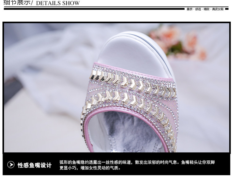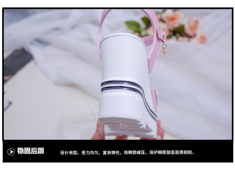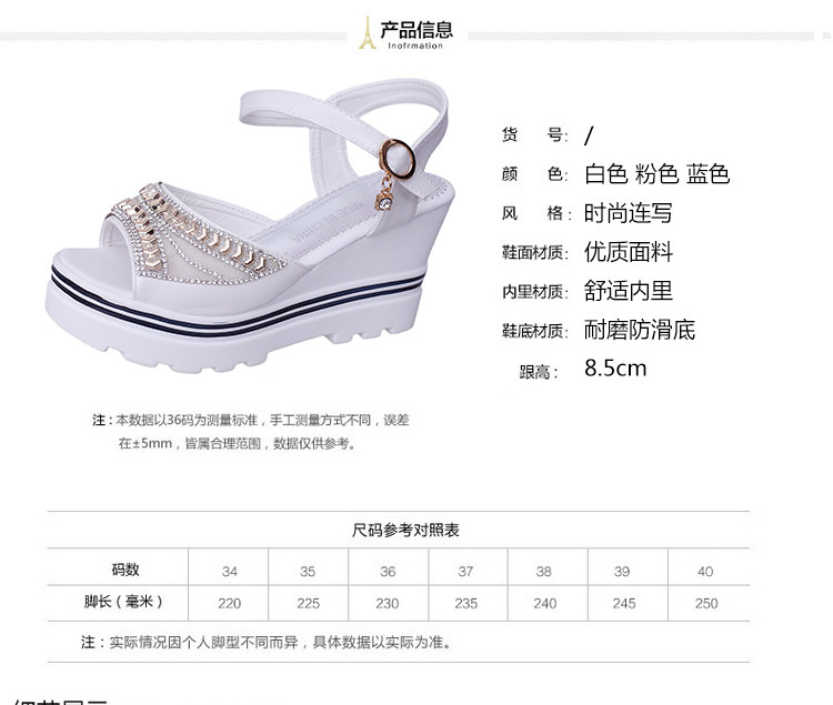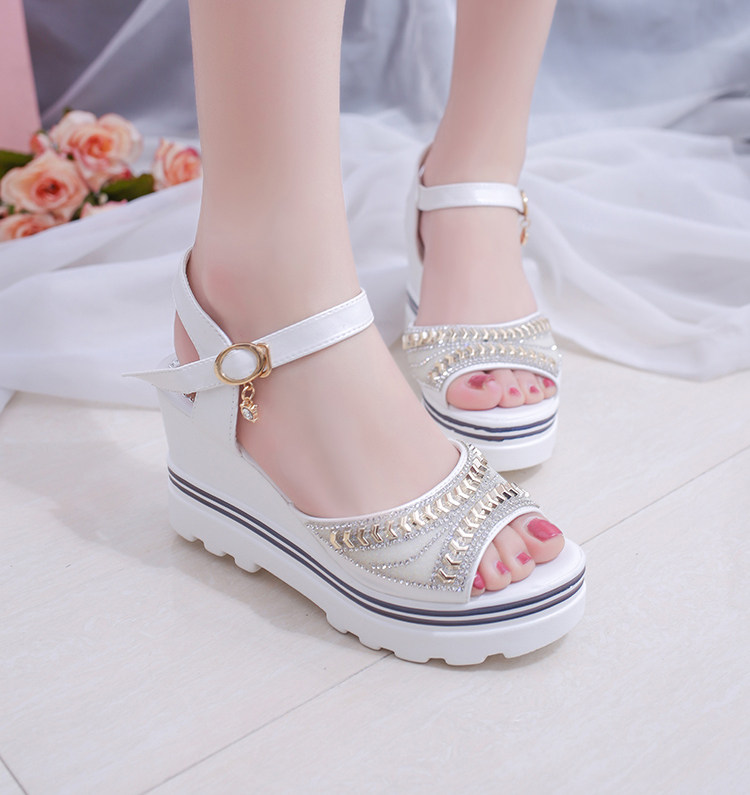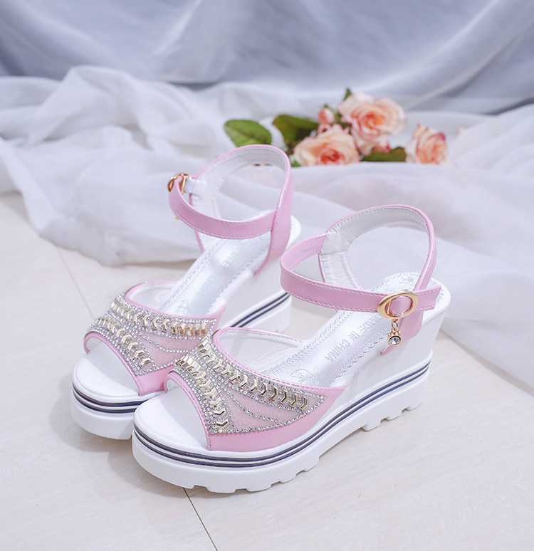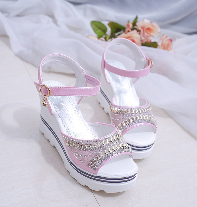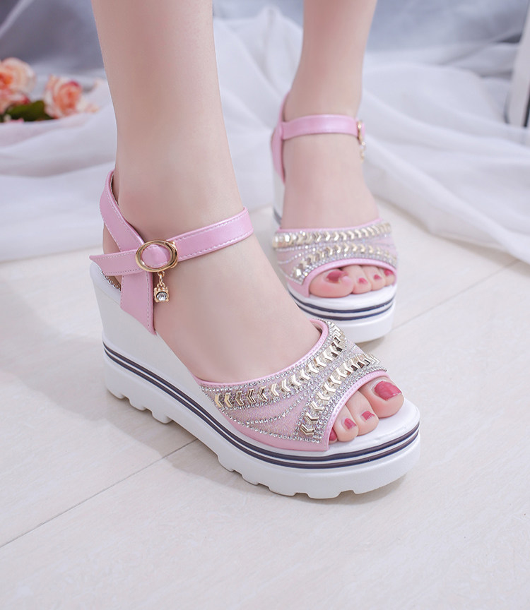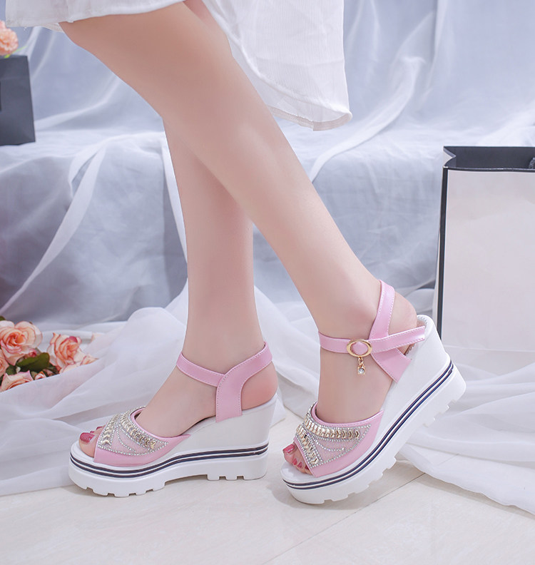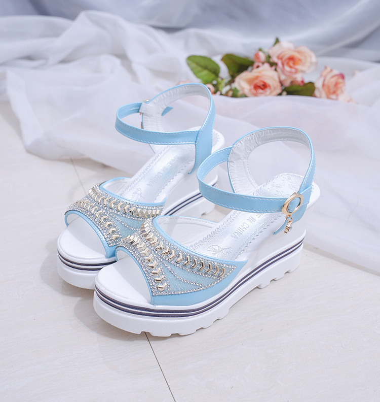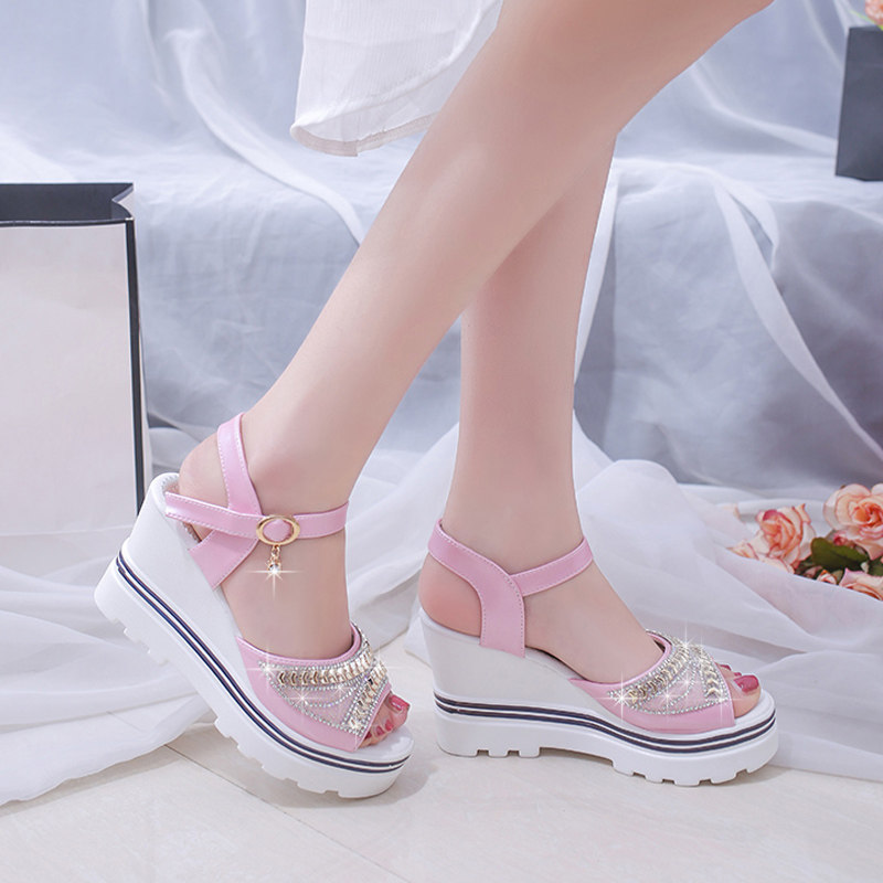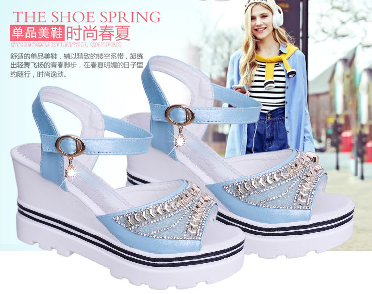 新款韩版坡跟女士凉鞋夏季水钻防水台鱼嘴一字扣学生松糕厚底