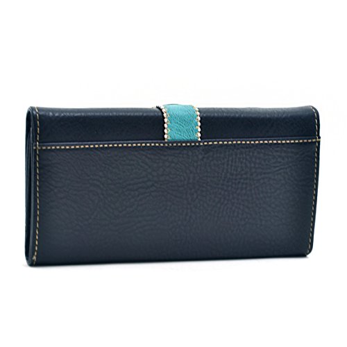 Wallet: Made of high quality faux leather. Trifold wallet secured by magnetic snap. Rhinestone buckle accent. 2 transparent ID window. 10 credit card slots.