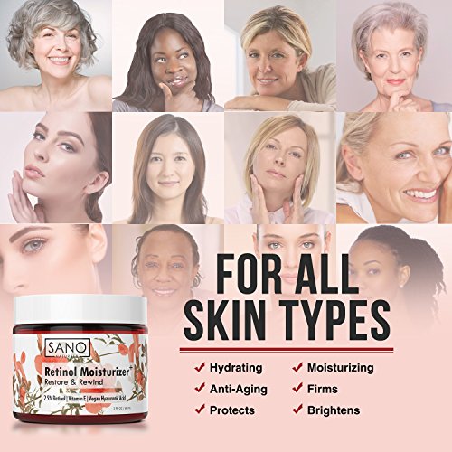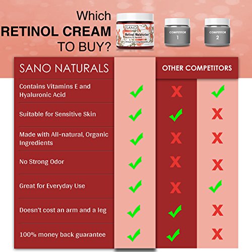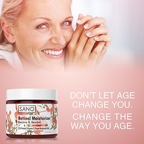 Best Retinol Face Moisturizer - Sano Naturals Retinol Moisturizer Anti Aging Cream uses the firming power of Vitamin A (Retinol) and Hyaluronic Acid to provide intense anti aging benefits for beautiful, clear, glowing and smooth looking skin. Our Anti Wrinkle Cream provides a strong dose of this renowned anti-aging antioxidant for optimal results. It is the Perfect Day or Night Cream to Reduce the appearance of Wrinkles, Milia, Acne Scars, Sun Spots, Hyperpigmentation and Signs of Aging.