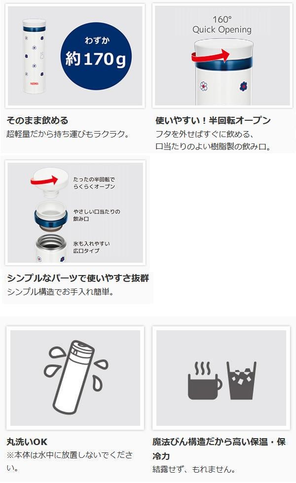 | 素材・材質 | 内びん:ステンレス鋼 胴部:ステンレス鋼(アクリル樹脂塗装) フタ:ポリプロピレン(発泡ポリプロピレン内蔵) せん本体:ポリプロピレン・ABS樹脂 フタパッキン・せんパッキン:シリコーン |