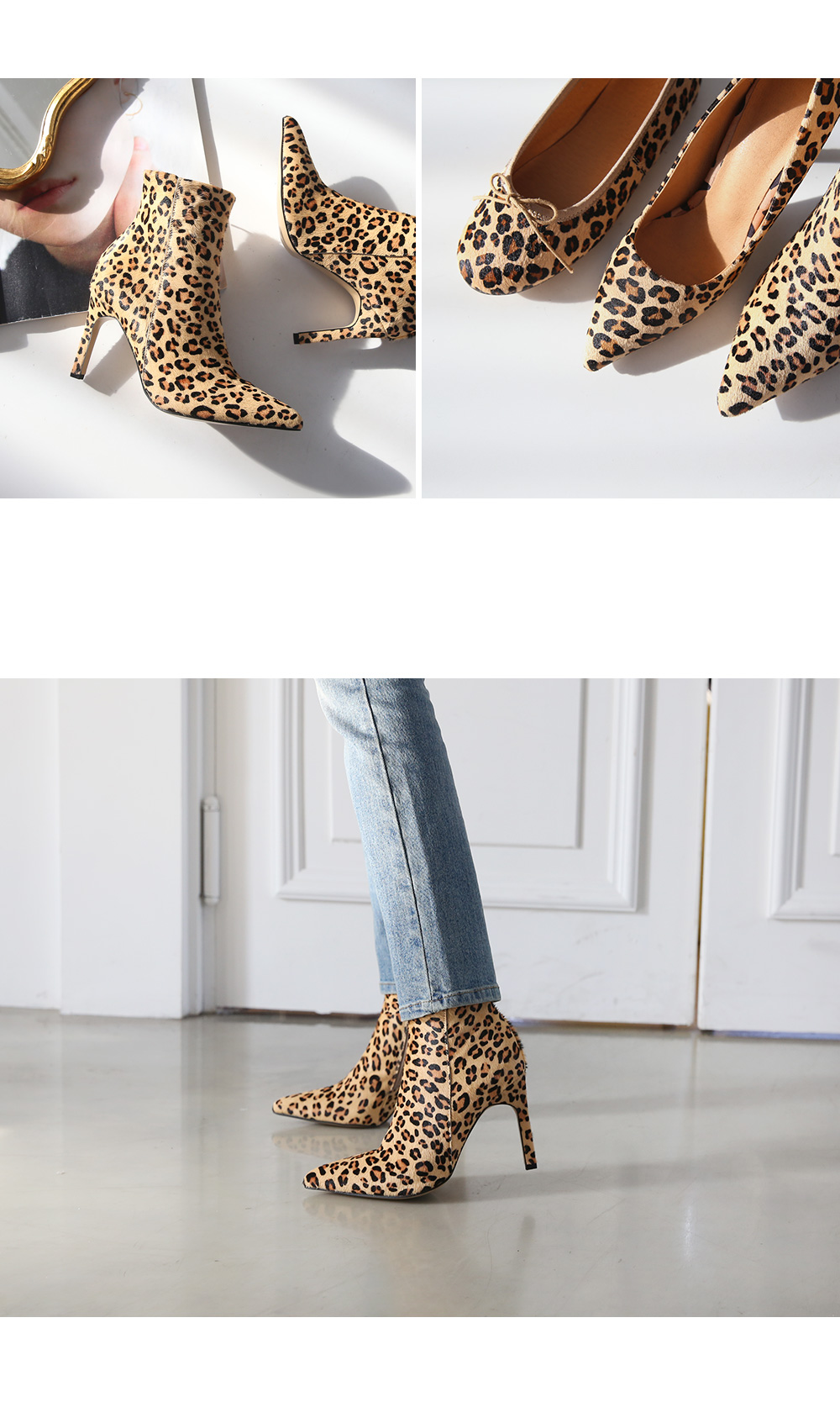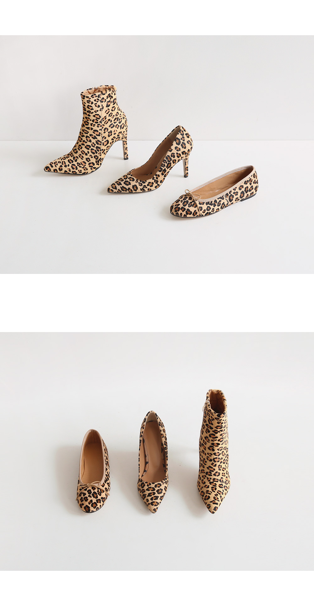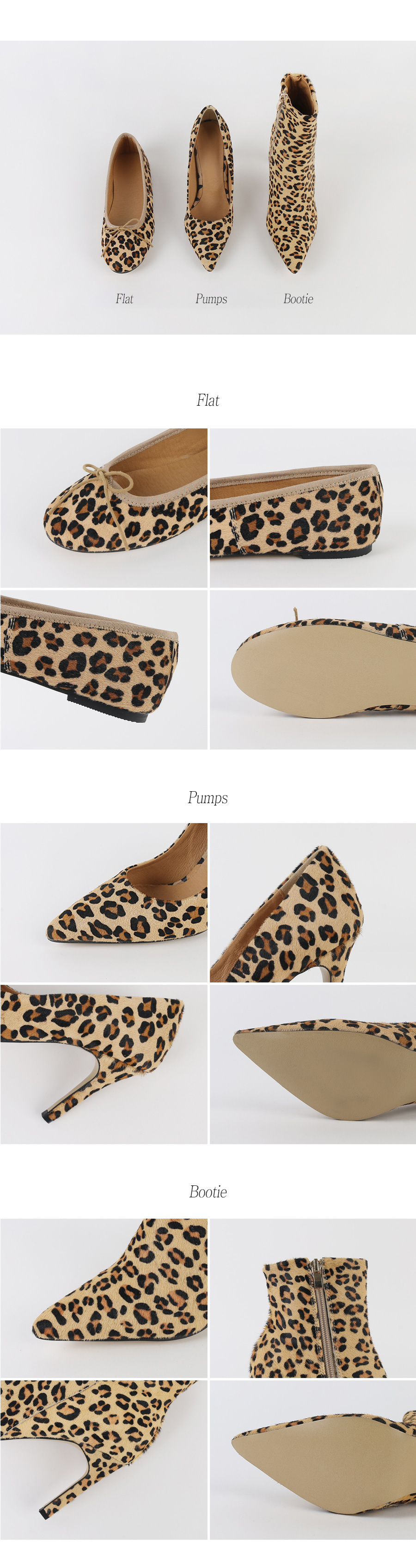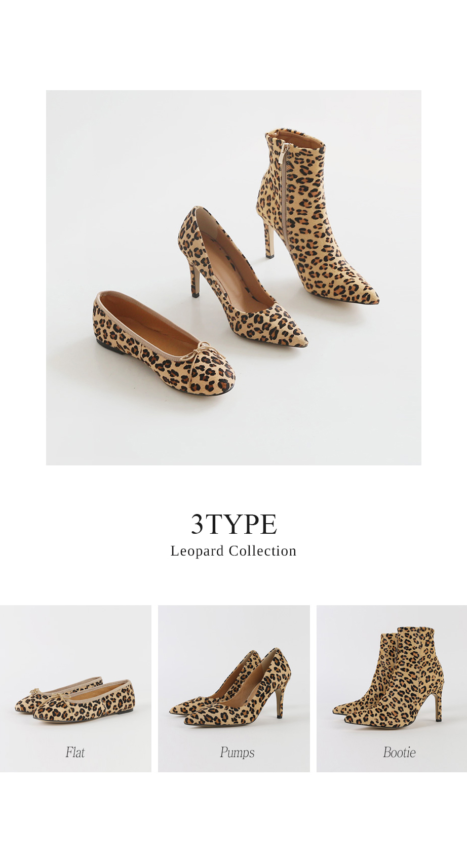 펌프스 플랫 앵클부츠 세가지 타입으로 제작하여 취향에 맞는 느낌으로 초이스되며 레오파드패턴으로 간결한 스타일링에 잔잔한 포인트가 되어줍니다.