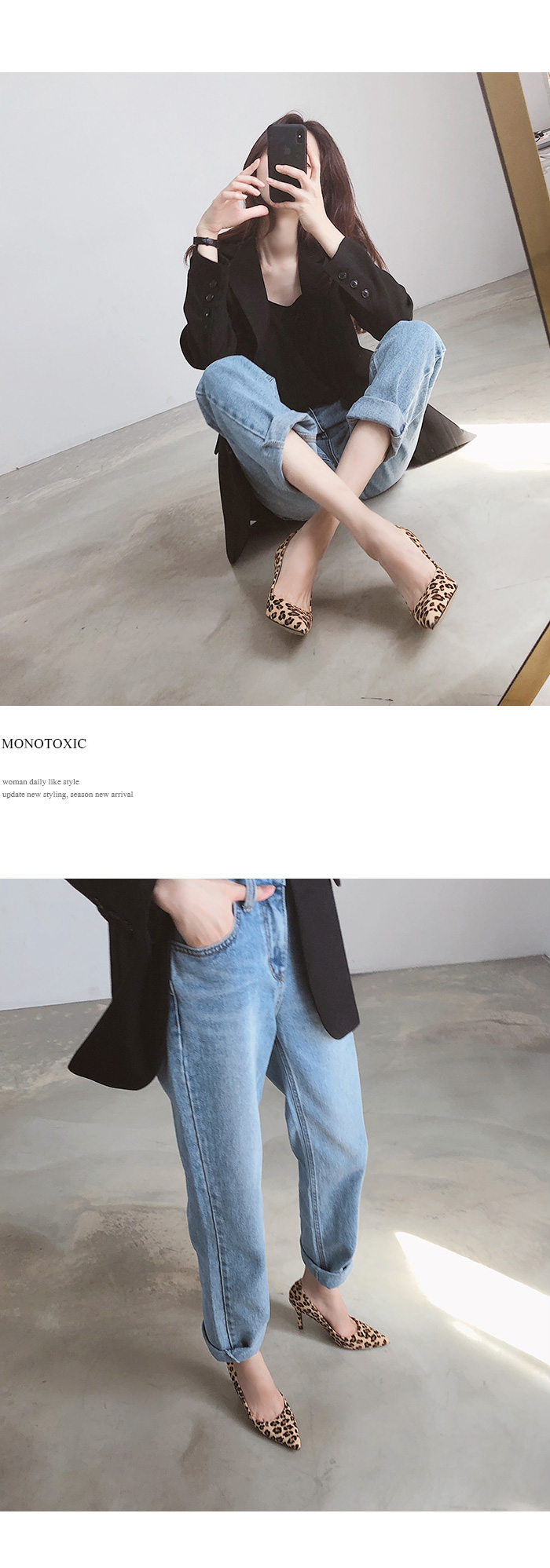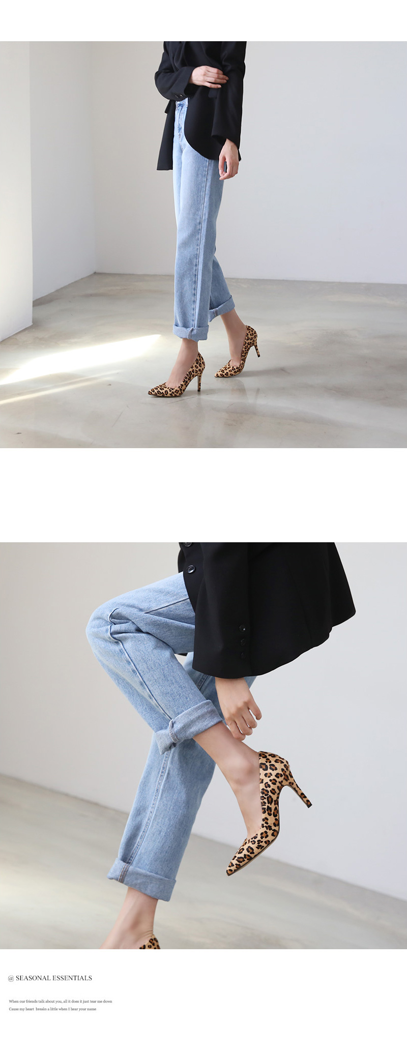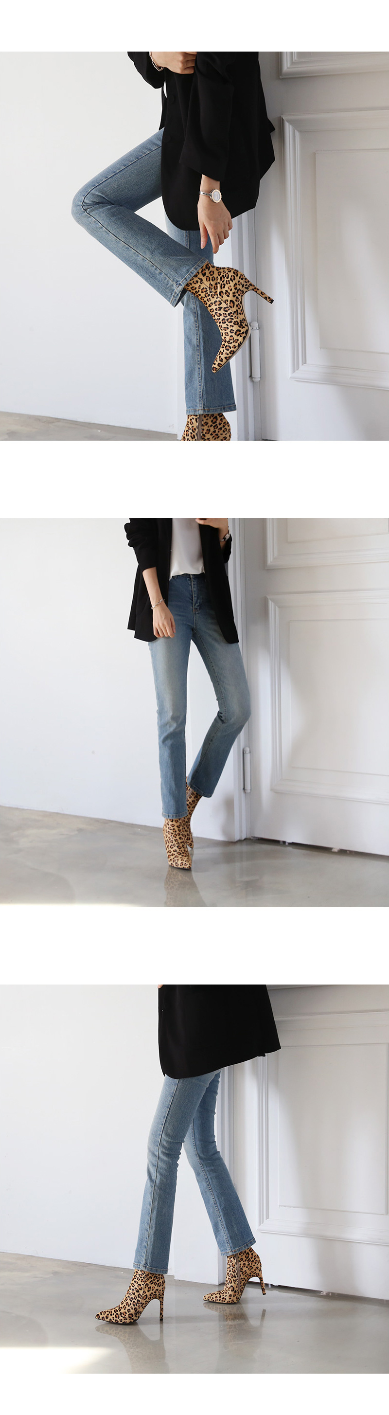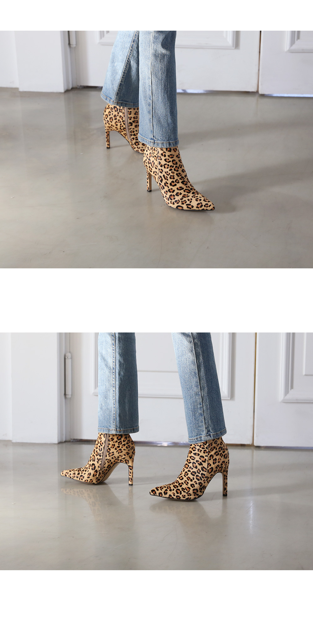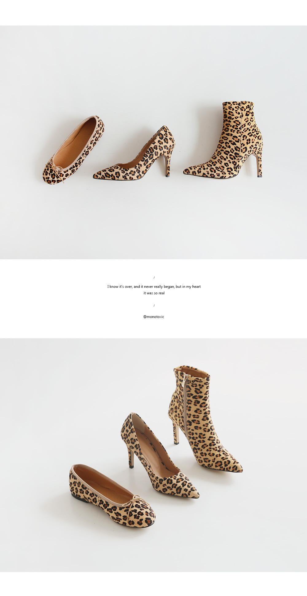 펌프스 플랫 앵클부츠 세가지 타입으로 제작하여 취향에 맞는 느낌으로 초이스되며 레오파드패턴으로 간결한 스타일링에 잔잔한 포인트가 되어줍니다.