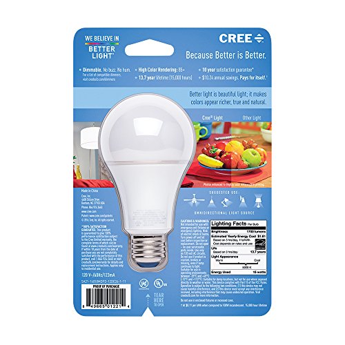 Studio : Cree Publisher : Cree Binding : Tools Home Improvement Product Description For people who aspire to create a beautiful and safe home for their family, the 100W equivalent Cree® LED bulb provides better light, better dimming, all backed by a better warranty. Featuring a cool (5000K), omnidirectional light with high color rendering, the Cree LED bulb is designed to enhance your home and make the colors of your decor appear vibrant, richer and more natural. Fully dimmable and built to light and last, the new Cree LED bulb provides 13.7 years (15,000 hours) of beautiful, energy-efficient light. The energy star® certified Cree LED bulb is a worry-free choice backed by one of the strongest warranties in the industry ? a 10 year 100% SATISFACTION guarantee. 0