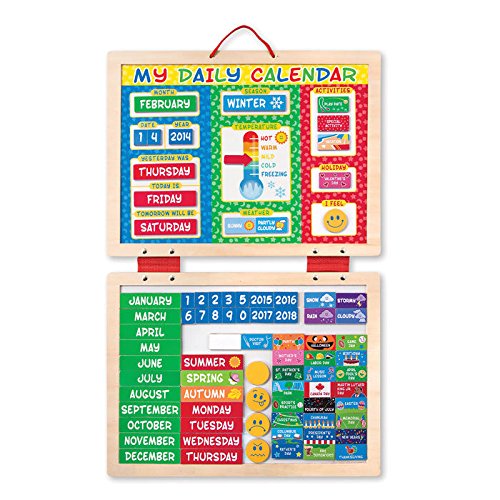 Studio : Melissa Doug Publisher : Melissa Doug Binding : Toy Product Description Melissa Doug My First Daily Magnetic Calendar. What is today? For a child, that simple question can have so many answers--and this daily calendar helps satisfy them all! Kids will feel a greater sense of control and responsibility when they help post the day of the week, date, weather, and special events on the large magnetic board for all to see. There's even a space to post their mood--an excellent way to open communication and encourage children to gauge their own emotions. Updating the information is simple: Simply take a preprinted magnet from the lower magnetic board (which hangs below the calendar to keep magnets within easy reach). Then place it on the calendar to fill in the information . . . or make a custom magnet by writing on one of two dry-erase magnet tiles! There are fields for day, date, season, weather, temperature, activities, holiday, and mood. For ages 3 yrs . Materials: 50% Plywood, 20% Paper, 20% Magnetic Material, 7% Metal, 2% String And Fabric, 1% Ink. Dimensions: 16.00"L x 25.00"W x 0.90"H Weight: 3.10 lbs 0