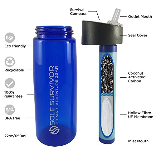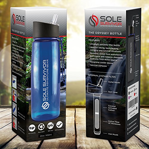Have you ever been concerned about water quality when or where you turn on a tap? Our health is the single most important thing in life and drinking the cleanest quality water is critical. Whether you're at a local park, travelling, camping, playing sport or trekking the one question you'll always want to know the answer to is Am I drinking clean water? With the Sole Survivor Odyssey Bottle the answer is Yes! Upgrade your Health with the Odyssey Bottle Today! 2 STAGE ACTIVATED CARBON and UF MEMBRANE FILTER - Dual stage filter process eliminates 99.999% of water bacteria. Simply put safe clean drinking water that will keep you hydrated and energized no matter where you are. LIGHT WEIGHT DURABLE GURANTEED NOT TO LEAK - Weighing in at under 1 pound (excluding water) with durable food grade rubber seals will ensure your pure water experience doesn't leak through your kit. FILTER 396 GALLONS (1500 liters) ON THE GO! - With any flowing water source, stream, river, water fall you’ll never be without clean drinking water. With its massive filtering capacity, you will be feeling physically and mentally stronger, safe in the knowledge that you will not run dry. NEOPRENE INSULATED BOTTLE SLEEVE (VARIOUS COLORS) - Not only protecting the bottle against the harsh environment it also protects your water from the hot and cold climates. Add your own individuality to your bottle with a range of vibrant sleeve colors. 100% MANUFACTURER GUARANTEE - We are so confident that our product represents the best quality on the market that if in the first 90 days you have any issues email us and we will be more than happy to provide a full refund or replacement. Click on ADD TO CART BUTTON NOW to start your clean drinking water experience! 0 |