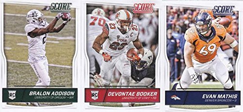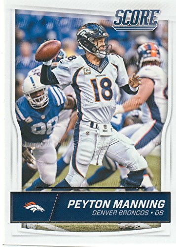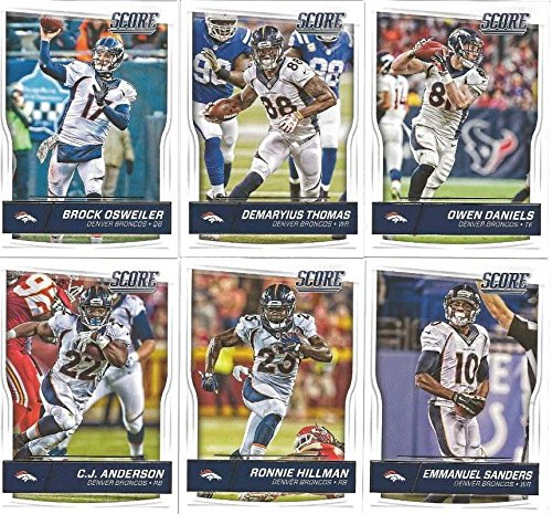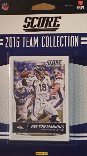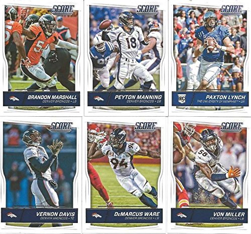 Denver Broncos 2016 Score factory sealed 15 card team set including Peyton Manning, Brock Osweiler, C.J. Anderson, Ronnie Hillman, Demaryius Thomas, Emmanuel Sanders, Owen Daniels, Vernon Davis, DeMarcus Ware, Von Miller, Brandon Marshall, Evan Mathis plus rookie cards of Bralon Addison, Devontae Booker and Paxton Lynch.