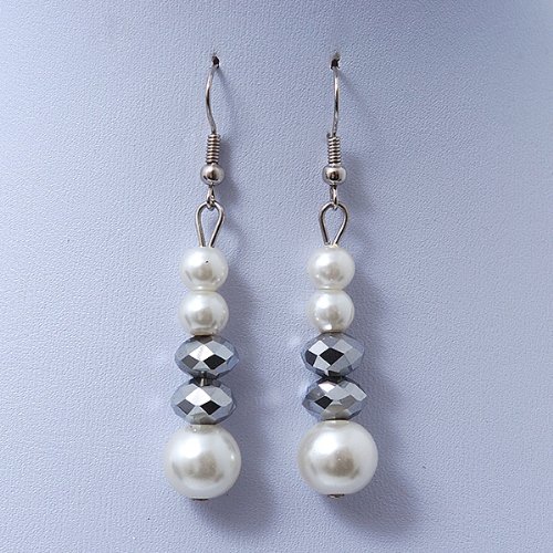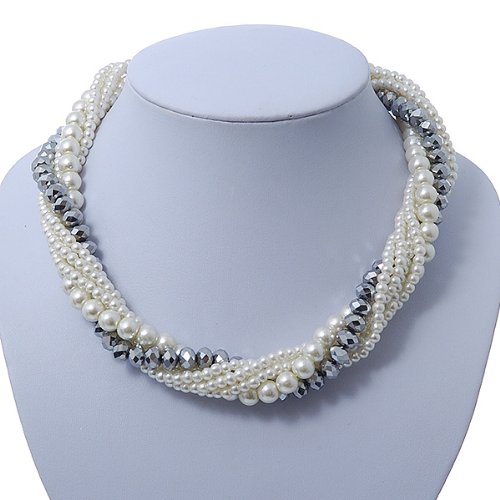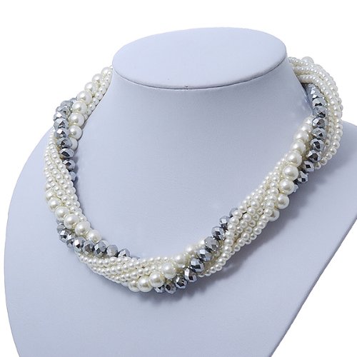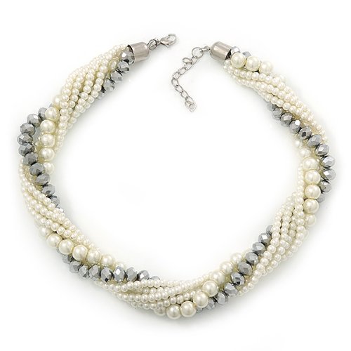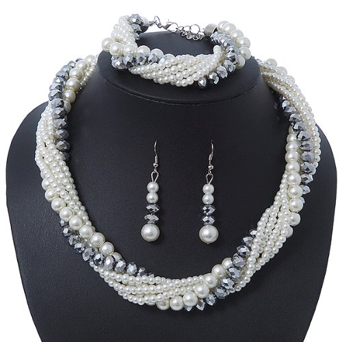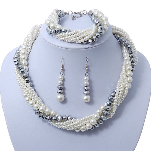 - Title : Bridal White, Metallic Grey Synthetic Pearl Bead Multi Strand Neckace, Bracelet & Drop Earrings Set In Silver Tone - 34cm Length/ 4cm Extender