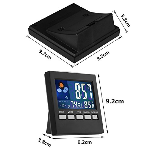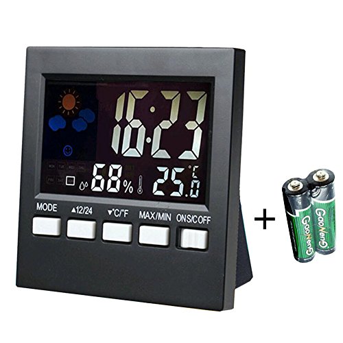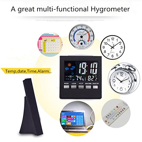 Studio : GUQI Publisher : GUQI Product Description Accuracy Indoor hygrometer digital hygrometer can have a significant impact on personal comfort,health,safety and the condition of valuables in your home. You can easily monitor the temperature and humidity of your home with professional accuracy,and whether environmental adjustments are needed to protect your family and possessions. The monitor features professional humidity and temperature sensors to provide accurate measurements and fast data reporting at an affordable price. Features: Display the time,date, week and measure temperature and humidity. Max and min temperature and humidity display. Weather forecast: sunny, partly sunny, cloudy, rainy and rainy. C/F temperature unit selectable. 12/24 hour time display selectable.LCD colorful display with backlight. Sound control function: when alarms or make a sound,the LED will light up. Sense light function: the backlight will automatically light up in darkness through ON S/C OFF.It also has alarm and snooze functions,too. Specifications: 1.Color : Black 2.Display : LCD screen with LED Backlight 3.Temperature Range :-10C - 61C /14F -142F 4.Humidity Range : 20%RH -99%RH 5.Temperature range : 0~50C 6.Temperature accuracy : /-1C 7.Humidity range : 10~99% 8.Humidity accuracy : /-5% 9.Dimension : 92X92X50MM 10.Package : 1 x Temperature and Humidity Monitor 11.Power : 2 * 1.5V AAA Batteries( Included ) Note: After setting year,month and day, the day of the week (Monday through Sunday)will be automatically set. And after setting the alarm clock,in any mode, press "△12/24"to turn on/off the alarm, when it turn on,the LCD screen appear a alam icon.After finish setting, when alarm rings,press SNOOZE/LIGHT button to turn on the snooze. 0