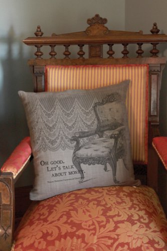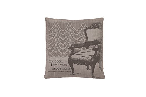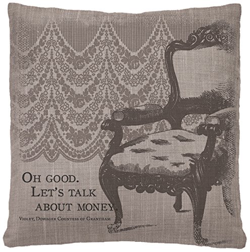 Heritage Lace Downton Abbey Iconic Talk About Money 18"x18" Gray Pillow. Our Iconic pillow features a favorite Violet, Dowager Countess of Grantham quote: "Oh Good. Let's talk about money." Pillow is printed with a tone-on-tone effect in shades of gray. A fun way to add a bit of humor and Downton Abbey style to any room. The Countess represents both tradition and contrast. The collection's white table linens, intricate lace and heirloom roses harken back to a more opulent era while Violet's wit and sensibilities speak to a modern age. Pillow measures 18" x 18" Insert included. Graphic art transfer. Hidden zipper closure. Mid-weight woven textile. Printed in the U.S.A. with imported components. Downton and Downton Abbey | 2014 Carnival Film and Television Limited. All Rights Reserved. 100-Percent polyester. Machine wash cold, gentle. Do not bleach. Lay flat or hang to dry. Touch up with cool iron if desired.Feature