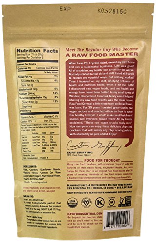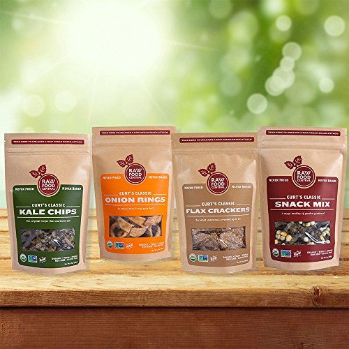 -. Feature : ll Raw Food Central snacks are the ultimate organic snacks for snackies, vegans, vegetarians or anyone looking for a complete healthy snack that is delicious / Raw Food Central snacks are organic, low-calorie, light and crispy healthy snacks that will satisfy your crunch buds; plus are full of usable fats, protein, are never fried or baked for pure raw goodness / One bite and you'll be devouring Raw Food Central's snacks; truly raw since they are not baked or fried so all the nutrients remain in the food as does the favorable healthy ingredients / All Raw Food Central snacks are certified: USADA Organic, Non-GMO verified Gluten Free, Vegan and Kosher and include good for you raw ingredients; so snack all you want / Raw Food Central snacks comes in a 4 pack of Kale Chips, Onion Rings, Flax Crackers, Snack Mix, Nut Clusters, Flax Crackers Cashew Crunch, Kale Chips Macho Nacho or Variety Pack (Kale Chips, Onion Rings, Flax Crackers and Snack Mix)