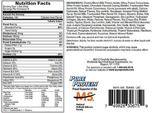-. Binding : Health and Beauty -. Brand : Pure Protein -. EAN : 0749826306742 -. Feature : 50 Grams Bar -. IsAdultProduct : 0 -. Label : Pure Protein -. Manufacturer : Pure Protein -. MPN : 507458 -. NumberOfItems : 6 -. PackageQuantity : 6 -. PartNumber : 507458 -. ProductGroup : Health and Beauty -. ProductTypeName : HEALTH_PERSONAL_CARE -. Publisher : Pure Protein -. Size : 50 GRM -. Studio : Pure Protein -. Title : Pure Protein Chocolate Peanut Caramel Bar, 50 Gram (Pack of 6) -. UPC : 749826306742