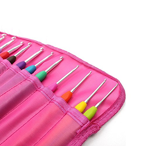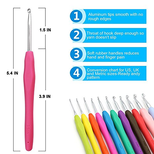 - High quality,this set of crochet hooks are TPR handle aluminum crochet,soft anti-slip rubber handle,the grips handle provides comfort when crocheting for longer period of time.No matter how many times you use it and they have stayed on tight.The depth of the groove is moderate and they are tapered,the top is slightly rounded.Crochet top length of 1.5 inches,the hook throat is deep enough to generously catch the yarn,this greatly improves your productivity.