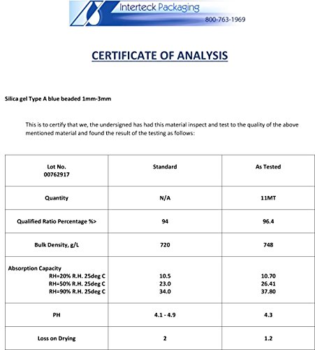 -. Feature : Interteck Packaging Inc. has Met the Needs of Food, Pharmaceutical, Industry, and the Consumer Market for More than 30 Years Supplying US Manufactured Products / Easy to Read Blue to Pink Indicating Silica Gel gives Quick Visual conformation, letting you Know it's Time to Recharge your Product. / Each Container of Indicating Silica Gel is Packaged with Low Moisture Vapor Transmission Film to ensure Product Quality. Every Product will arrive Air Tight and Factory Sealed in our Resealable Barrier Pouch. / Our Indicating Silica Gel helps Control Moisture, Mildew, Mold, and Corrosion. Common Uses for Protecting Important Valuables include; Firearms / Ammo Cans, Clothing, Camera Equipment / Electronics, Documents, Photographs, Jewelry, and Books. / Satisfaction Guaranteed or your Money Back. Please Contact us With Any Product or Ordering Questions. You Will Receive a Quick Response and Solution.