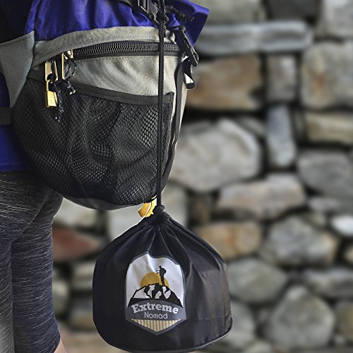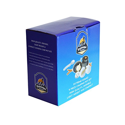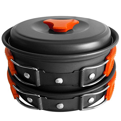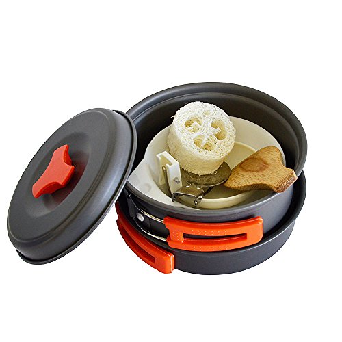 DURABLE, COMPACT AND LIGHTWEIGHT--The pot, pan and lid in this set are made from non-toxic anodized aluminum that is made to last for years. It is incredible easy to clean this set with the included loofah cleaning sponge. The entire set weighs only 14 ounces which is very lightweight and this set is extremely east to store and is compact. The compact canvas bag enclosing the cooking set can be attached to the exterior the your backpack with the drawstrings.