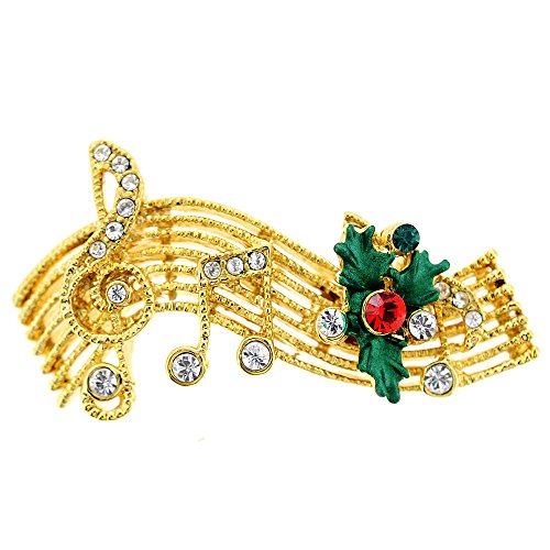 This festive brooch features a note design rendered in goldtone or silvertone base metal with green and red coloring and glittering Swarovski crystal accents. This brooch comes complete with classic pin closure. Specifications Size 1.625 x 0.875 inches Frame Color Golden tone Stone color Crystal Siam Emerald