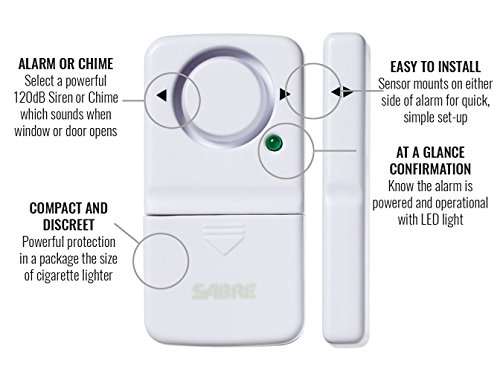 A burglary occurs every 14.5 seconds in the U.S., and budget cuts have led to an average 911 response time of 10 minutes. Now available in a four-pack for a greater value, the attention-grabbing Door or Window Alarm is 120 dB alarm and audible up to 750 feet (230 m) away. The user-friendly home security alarm comes with three adjustable settings: off, alarm and chime, which is ideal for alerting you when children or guests come and go while you’re at home. Featuring a consumer preferred premium white, this attractive alarm looks great in your home. With no wiring needed, the Door or Window Alarm works during power outages – 4xLR44 batteries are included for a greater value. Installation is a breeze, as the self-adhesive pad is included and the sensor mounts on either side of the alarm. For an added level of security, the alarm features a low battery test button. The Door or Window Alarm was developed by SABRE, the #1 pepper spray brand trusted by police and consumers worldwide, meaning this product is extremely reliable. Backed by 40 years in the security industry, SABRE products are ISO 9001:2008 certified and must pass rigorous quality assurance testing before leaving our facilities to give you peace of mind. Improve your home security today.Feature