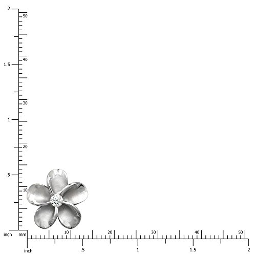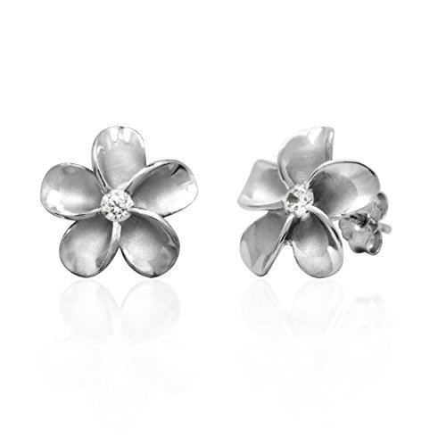 A pair of sterling silver plumeria stud earrings, each with a twinkling CZ stone center. Flowers are 14mm wide (about 9/16 of an inch). Gift box included. From Honolulu Jewelry Company, Honolulu, Hawaii.Feature