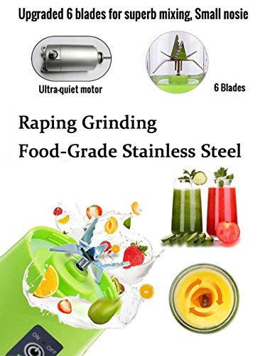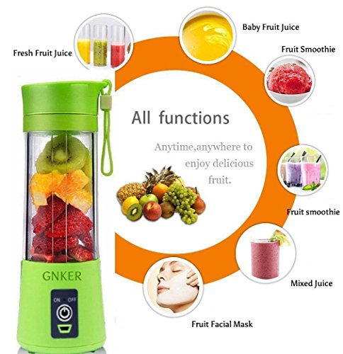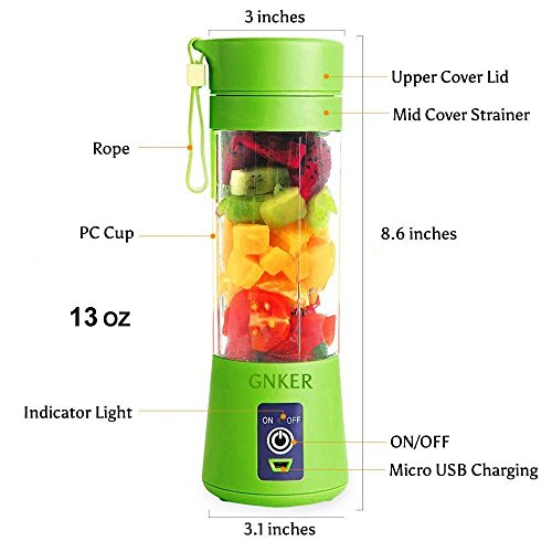 Easy to carry - with lightweight design, the USB juicer is small and portable, which allows you to hike, drive, gym, travel, wild camping picnic carry easy to clean - the best juicer can be divided into the cup and the bottom of the juicer blender cup to cleaning, which can washed with water directly specifications: Volume: 13 oz./380 ml battery capacity: 2000 mah charging time: About 3 hours single working time: 40s working time after full charged: 10-12 times idle protection: Turn off in 5s material: Food grade pc + food grade rubber seal power supply: Mobile phone charge or power bank. Note: Vegetable juicer, before first use, please charge for 2 to 3 hours. Food juicer, when squeezed fruit, need to add some water or milk, too much or big fruit pieces or without water may get blades stuck. Upside down the machine so that the blades can start to run, then you can turn it back. Screw the cup and foundation correctly and tightly, or it won't work. To control the capacity of juice under the 70%-80% cup body capacity is appropriate. Do not open the lid during motor running in case the fruit particles splash out to hurt someone around. Please do not let the motor idling long time. Before cleaning, make sure the machine is off and keep the machine base away from water, or it will not work. Cold press juicer, do not too much ice. Do not carry dry ice and carbonated drinks. Cleaning, please use a neutral detergent. Do not use chlorine bleach, so as not to rust. Do not put the juicer machine base into water or the base elements won't work. Package including: 1 x fruit vegetable juicer 1 x cup cleaning brush 1 x peeler 1 x fruit open peeler 1 x micro USB charging cable 1 x instruction manual.Feature
