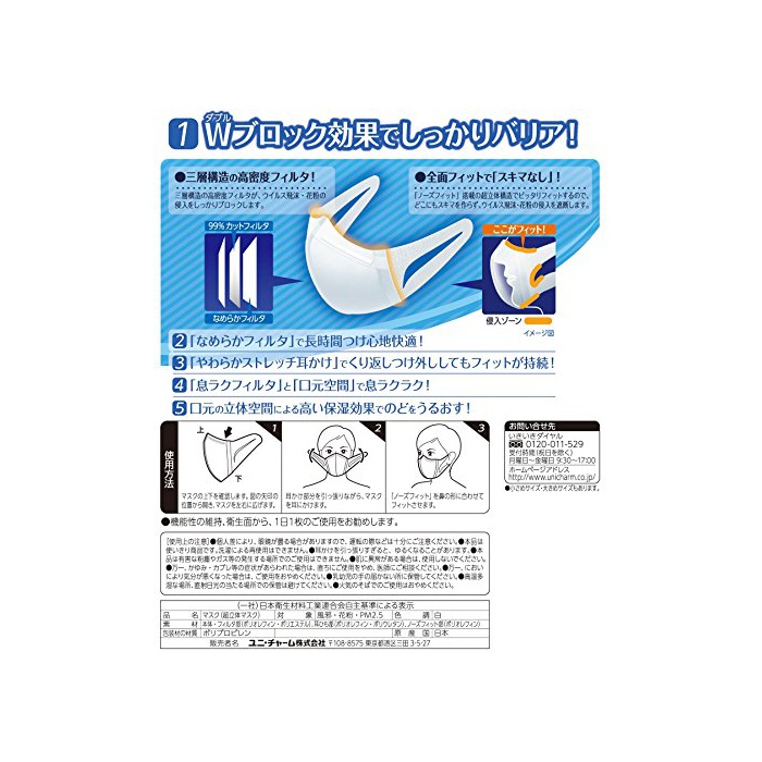 (일본제 PM2.5대응)초입체 마스크 감기 화분용 보통 사이즈 7매입(unicharm)