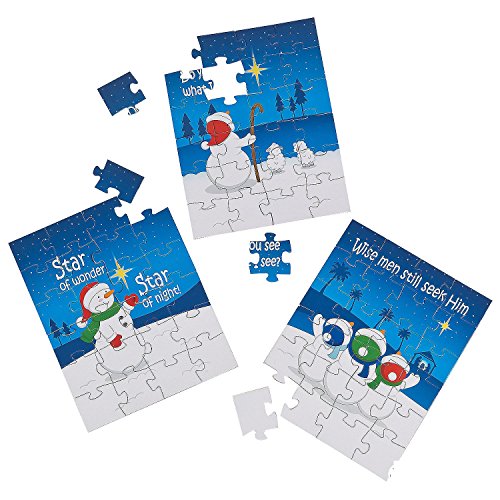 Studio : Fun Express Publisher : Fun Express Binding : Toy Product Description Spread the holiday cheer with these Faithful Snowmen Christmas Puzzles. A must for stocking stuffers, each 24-pc. puzzle comes in a 2 1/4" x 3/4" x 3 3/4" box and features "Wise men still seek Him" messaging. Excellent for church giveaways, Christmas gifts and more this magical holiday season. Cardboard. 5" x 6 1/2" ⓒ OTC 0