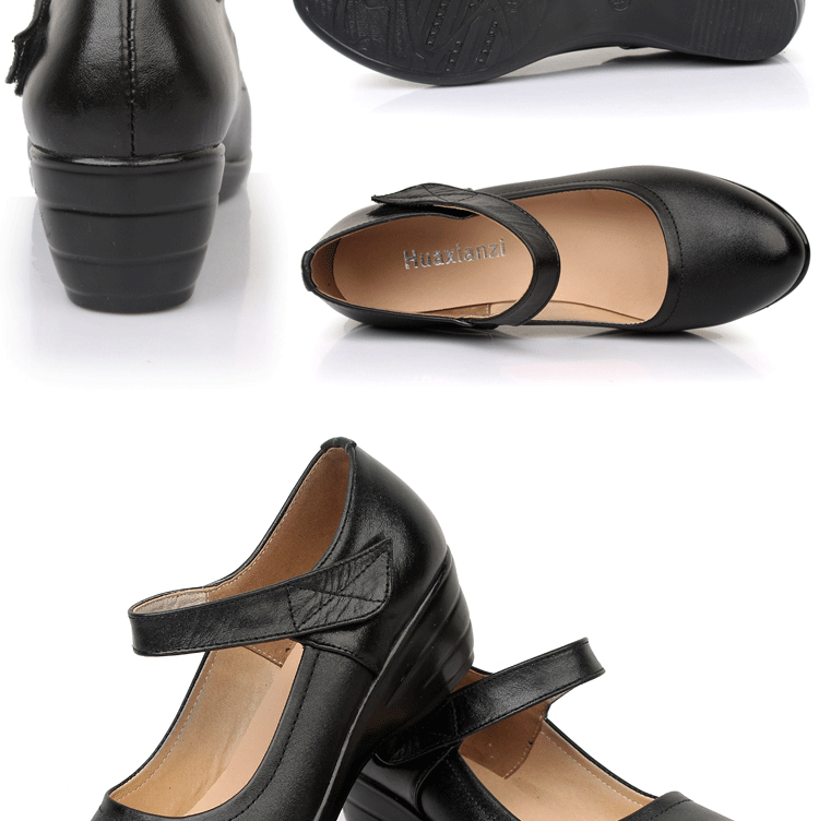 秋季女鞋牛皮妈妈鞋舒适工作鞋坡跟边带单鞋真皮走秀鞋