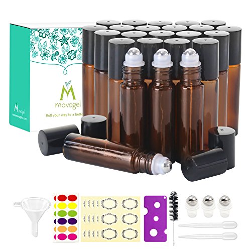 24, 10ml Roller Bottles for Essential Oils - Amber, Glass with Stainless Steel Roller Balls by Mavogel (3 Extra Roller Balls, 54 Pieces Labels, Opener, Funnel,...