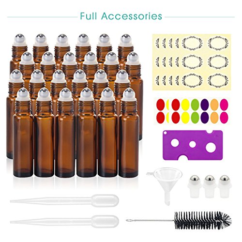 - ★VALUE SETS - 24 Pack 10ml amber essential oil roller bottles with leak proof design metal roller balls and black caps. Including 3 extra ordinary roller balls, 54 pieces labels, 1 Opener, 1 funnel, 2 dropper and 1 bottle brush