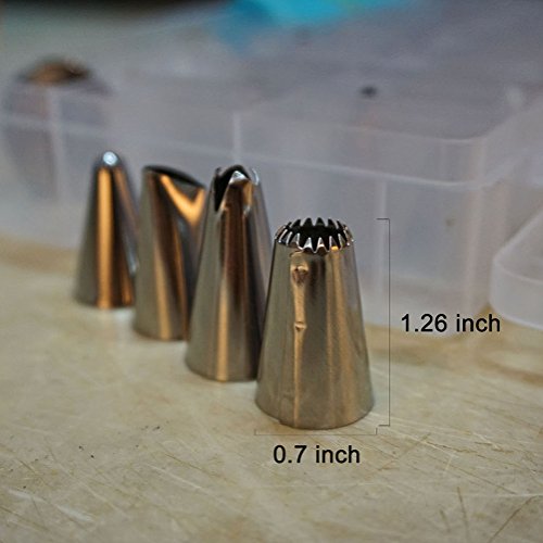 - Specification about All Items - 32 nozzles diameter: 0.67”, length: 0.98”, shaped with closed star, open star, French, round, plain, leaf, petal and so on. 12 inch bag fits any size tips after proper trimming. Coupler is compatible with any standard tips.