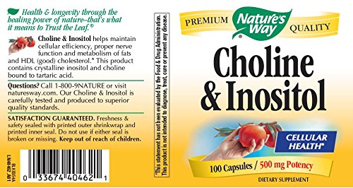 -. Binding : Health and Beauty -. Brand : Nature's Way -. Feature : Choline & Inositol help maintain cellular efficiency, proper nerve function and metabolism of fats and HDL (good) cholesterol / Nature's Way -. Label : Nature's Way -. Manufacturer : Nature's Way -. ProductGroup : Health and Beauty -. ProductTypeName : HEALTH_PERSONAL_CARE -. Publisher : Nature's Way -. Studio : Nature's Way -. Title : Nature's Way Choline and Inositol, 250mg, 100 Capsules