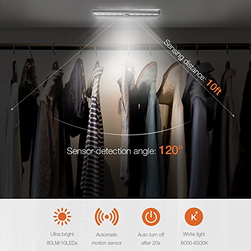 - AUTO MONTION SENSOR: Automatically turns on when sensing any presence or movement and turns off after 15 seconds of inactivity when no more sensing presence or movement. Highly sensitive sensor can detect the movement within 10ft distance and 120 - degree sensing range, so when you approach at night, it will sense your presence and light up your way. ( Note: The cabinet light will turn on only when it is dark and when motion is detected to conserve battery life ).