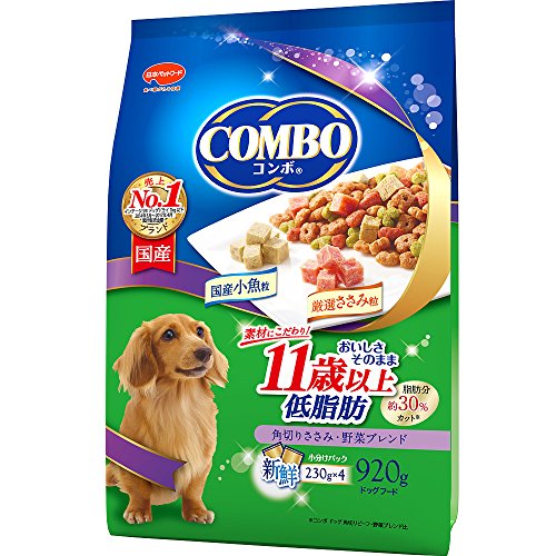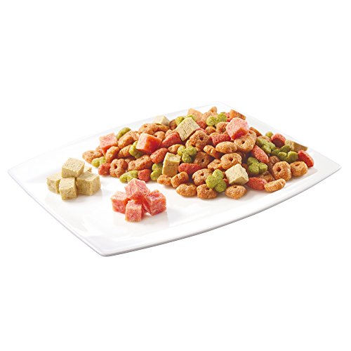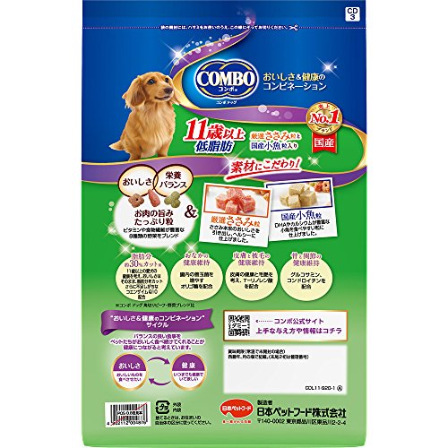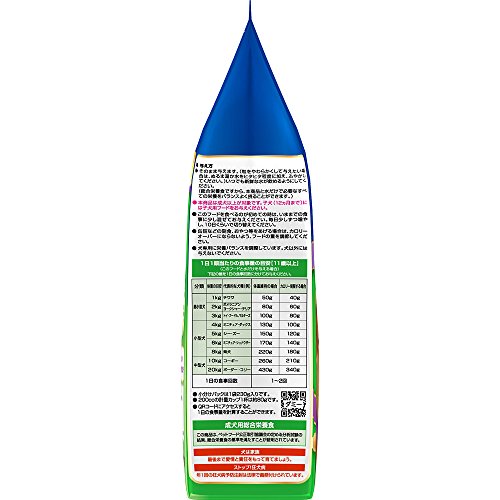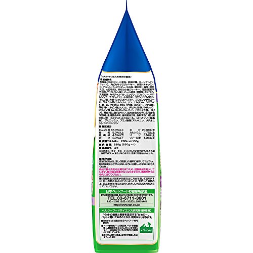 原材料:穀類(トウモロコシ、小麦粉、脱脂米糠、コーングルテンフィード)、角切りササミジャーキー、肉類(チキンミール、チキンレバーパウダー、牛肉粉、豚肉粉)、豆類(脱脂大豆、大豆粉末)、角切り小魚ジャーキー、油脂類(動物性油脂、γーリノレン酸)、ビール酵母、野菜類(キャベツ、大麦若葉、カボチャ、トマト、ニンジン、ブロッコリー、ホウレンソウ、モロヘイヤ)、小魚粉末、コエンザイムQ10、オリゴ糖、カゼインホスホペプチド、プロピレングリコール、ミネラル類(カルシウム、リン、ナトリウム、クロライド、鉄、銅、マンガン、亜鉛、ヨウ素、コバルト)、リンゴ酸、保存料(ソルビン酸カリウム、デヒドロ酢酸ナトリウム)、ビタミン類(A、B2、B6、B12、D、E、パントテン酸、コリン)、着色料(二酸化チタン、食用赤色102号、食用赤色106号、食用黄色4号、食用黄色5号、食用青色1号)、酸化防止剤(ミックストコフェロール、ローズマリー抽出物)、グルコサミン、アミノ酸類(アルギニン、メチオニン)、コンドロイチン