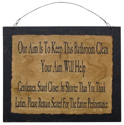 - Our primitive signs feature friendly reminders, inspirational quotes, and humorous messages stenciled on a tea-dyed background and set on a distressed black wooden board. Clean Bathroom design reads: "Our Aim Is To Keep This Bathroom Clean, Your Aim Will Help", with reminders for ladies and gentlemen. 10" H x 12" W, with wire hanger.