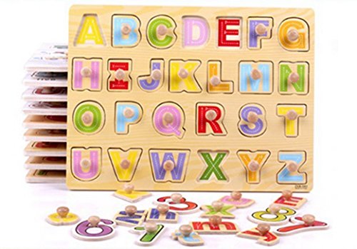-. Feature : This puzzle is just perfect for your toddler. Small hands can easily remove each piece revealing a matching full color illustration underneath. The puzzle develops dexterity, counting skills and improves hand-eye coordination. / 26 colorful alphabet letters with peg. / Encourages memory, hand-eye, fine motor and creative expression skills. / Sturdy wooden construction, non-toxic / For ages 1 years+
