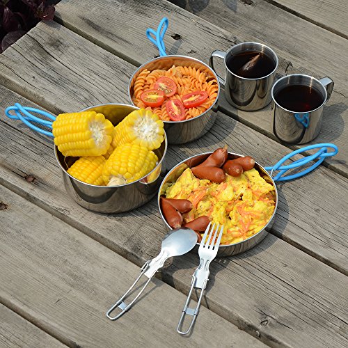 Studio : iGopeaks Publisher : iGopeaks Product Description Feature Camping Cookware Kit is for anyone loves outdoor activities. Space saving design, all the objects in this cooking set can be stored together in a mesh bag for convenient carry. The anti-slip pot handles and the silicone cup protector are all anti-heat and can effectively protect your hands from injury. One Kit meets all your needs! It will be your great outdoor companion, no matter you go camping, hiking, climbing, hunting or just go for a picnic! Specification Material: stainless steel; Size: Pot (large): (D) 5.3 '/ 13.5 cm, (H) 2.5 '/6.5 cm (1 Liter Capacity); Pot (small): (D)4.9 '/12.5 cm, (H) 2.3 '/ 6 cm (600mL Capacity); Dish: (D) 5 '/12.8 cm, (H) 1.1 '/2.8 cm; Cup :(D) 2.8 '/7.2 cm, (H) 2.6 '/ 6.6cm; 16 Pieces Set Package includes 1 x Pot (small) 1 x Pot (large) 1 x Pot Cover 1 x Frying Pan 1 x Spoon 1 x Fork 2 x Cup 2 x Dishes 1 x Portable Oil Bottle 2 x Cruets 1 x Wooden Spoon Spatula 1 x Cleaning Sponge 1 x Carry bag 11 Pieces Set Package includes 1 x Pot (small) 1 x Pot (large) 1 x Pot Cover 1 x Frying Pan 1 x Spoon 1 x Portable Oil Bottle 2 x Cruets 1 x Wooden Spoon Spatula 1 x Cleaning Sponge 1 x Carry bag 0