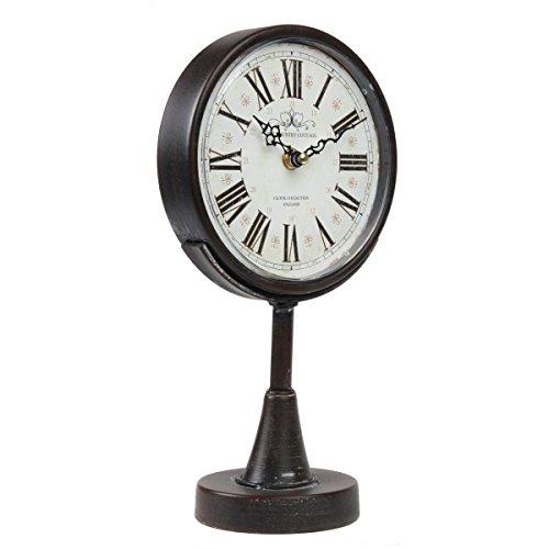 An Old World Clock That Keeps You In The Moment . This vintage-inspired clock has intricate detailing that you'll admire for years to come. Distressed face and scroll design hands appear as though they're from another century. Wide base is sturdy and easily kept on a mantle, desk or kitchen counter. Large roman numerals are easy to read from a distance. Quartz movements, 1-AA battery powered. Looks elegant with Victorian vintage or rustic decor. 0 |
