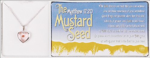 In Matthew 17:20, Jesus tells us that with faith even as small as a mustard seed, we can be used by God to accomplish great things. This glass heart necklace, displaying a real mustard seed, is a powerful visual reminder of that truth. Comes in a lovely presentation gift box with the poem The Mustard Seed, inspired by the scripture verse. Heart pendant has silver plated rim and is 1/2 inch long. The chain is 18 inches long. The Mustard Seed poem is copyright Dicksons, Inc.Feature