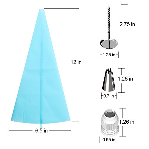 - Decorating Patterns: 11 open star tips, 7 closed star tips, 3 french tips, 3 round tips, 2 plain tips, 4 leaf tips, 3 rose petal tips, 3 special tips. 0.7 inch in diameter, 1.26 inch tall. Two 12' reusable silicone pastry bags are support different color icing while decorating cakes or cupcakes.